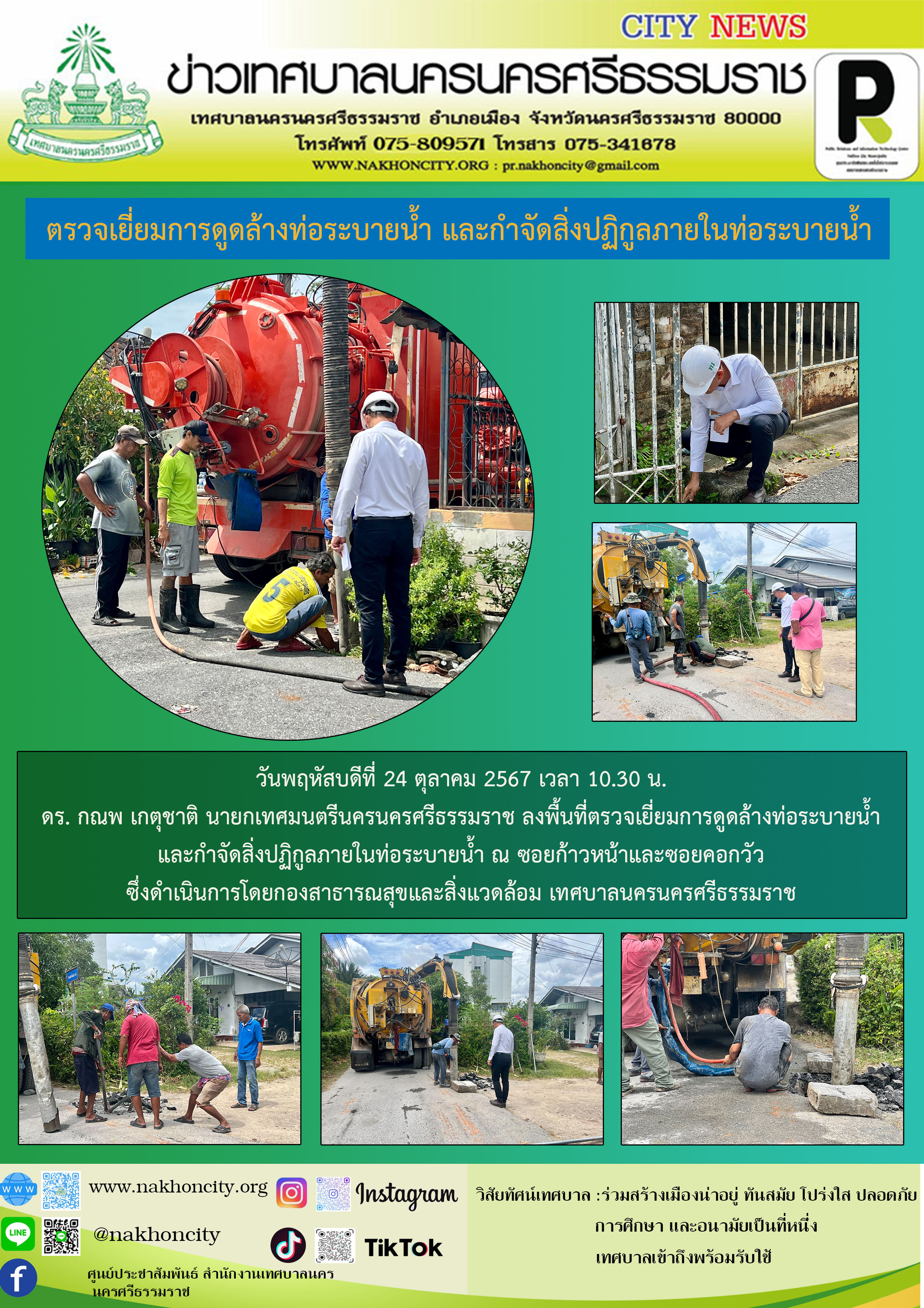 | วันพฤหัสบดีที่ 24 ตุลาคม 2567 เวลา 10.30 น. ดร. กณพ เกตุชาติ นายกเทศมนตรีนครนครศรีธรรมราช ลงพื้นที่ตรวจเยี่ยมการดูดล้างท่อระบายน้ำและกำจัดสิ่งปฏิกูลภายในท่อระบายน้ำ ณ ซอยก้าวหน้าและซอยคอกวัว ซึ่งดำเนินการโดยกองสาธารณสุขและสิ่งแวดล้อม เทศบาลนครนครศรีธรรมราช |