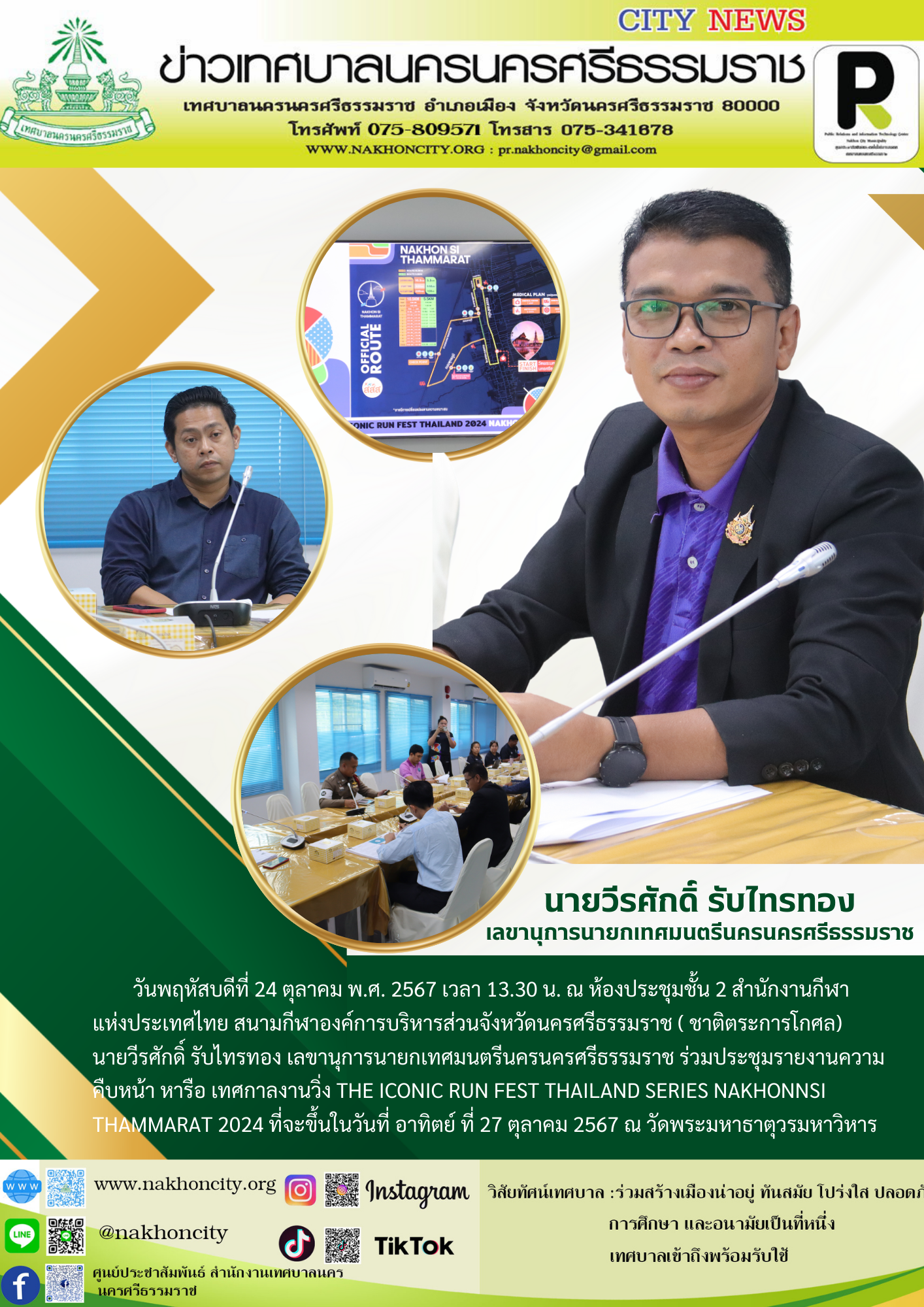 | นายวีรศักดิ์ รับไทรทอง เลขานุการนายกเทศมนตรีนครนครศรีธรรมราช ร่วมประชุมรายงานความคืบหน้า หารือ เทศกาลงานวิ่ง THE ICONIC RUN FEST THAILAND SERIES NAKHONNSI THAMMARAT 2024 |