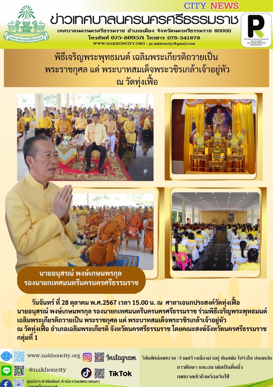 | วันจันทร์ ที่ 28 ตุลาคม พ.ศ.2567 เวลา 15.00 น. นายอนุสรณ์ พงษ์เกษมพรกุล รองนายกเทศมนตรีนครนครศรีธรรมราช ร่วมพิธีเจริญพระพุทธมนต์ เฉลิมพระเกียรติถวายเป็น พระราชกุศล แด่ พระบาทสมเด็จพระวชิรเกล้าเจ้าอยู่หัว ณ วัดทุ่งเฟื้อ อำเภอเฉลิมพระเกียรติ จังหวัดนครศรีธรรมราช โดยคณะสงฆ์จังหวัดนครศรีธรรมราช กลุ่มที่ 1 |