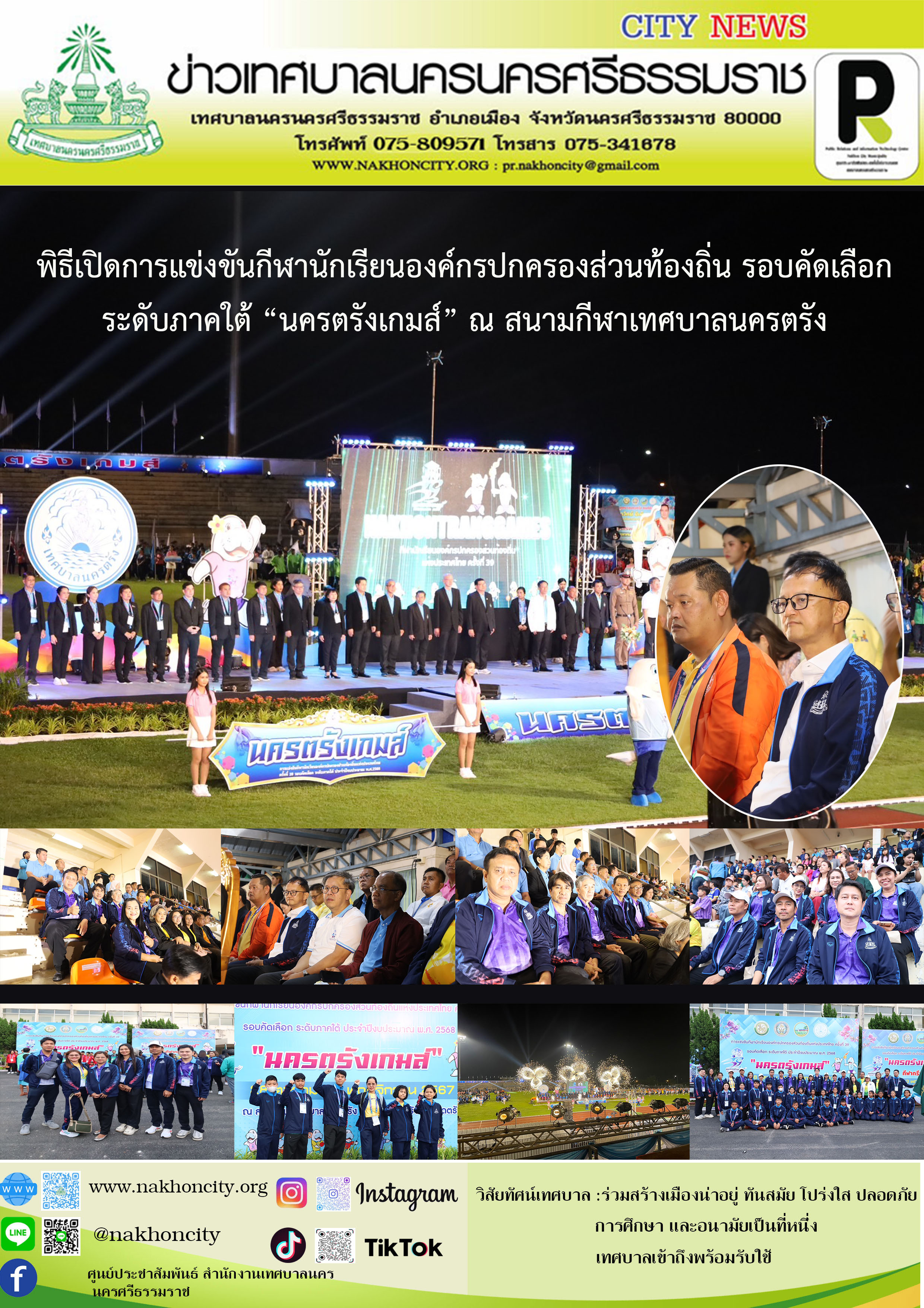 | นายกเทศมนตรีนครนครศรีธรรมราช พร้อมด้วย คณะผู้บริหาร หัวหน้าส่วนราชการ คณะครู และนักกีฬาโรงเรียนสังกัดเทศบาลนครนครศรีธรรมราช ร่วมพิธีเปิดการแข่งขันกีฬานักเรียนองค์กรปกครองส่วนท้องถิ่น รอบคัดเลืก ระดับภาคใต้ “นครตรังเกมส์” |