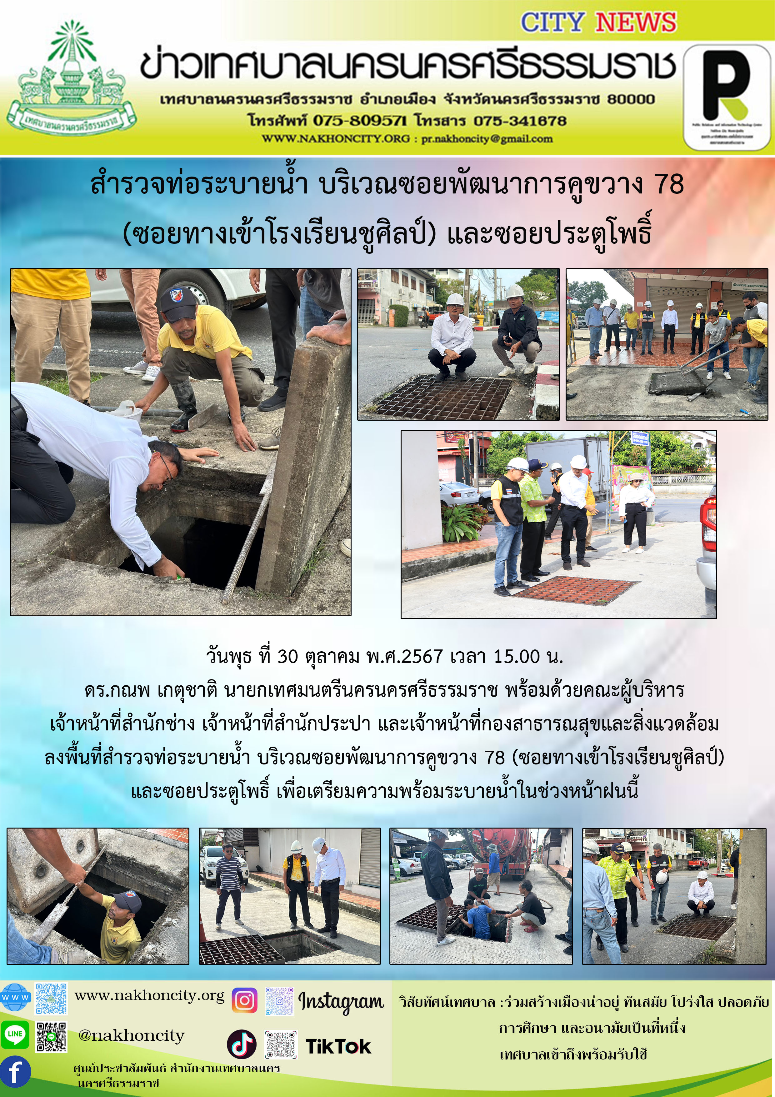 | นายกเทศมนตรีนครนครศรีธรรมราช พร้อมด้วยคณะผู้บริหาร เจ้าหน้าที่สำนักช่าง เจ้าหน้าที่สำนักประปา และเจ้าหน้าที่กองสาธารณสุข และสิ่งแวดล้อม ลงพื้นที่สำรวจท่อระบายน้ำ บริเวณซอยพัฒนาการคูขวาง 78 (ซอยทางเข้าโรงเรียนชูศิลป์) และซอยประตูโพธิ์ |