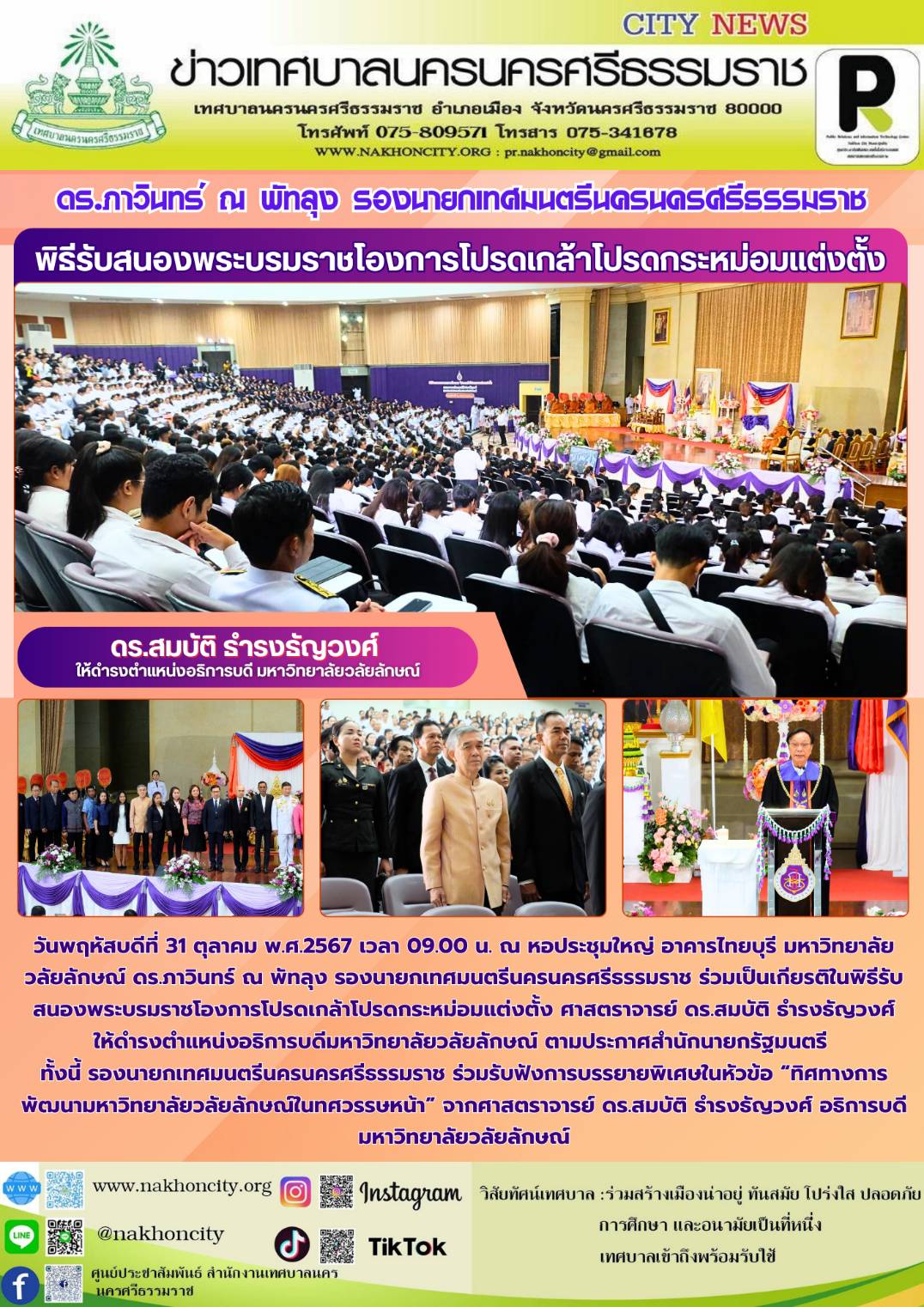 | วันพฤหัสบดีที่ 31 ตุลาคม พ.ศ.2567 เวลา 09.00 น. ณ หอประชุมใหญ่ อาคารไทยบุรี มหาวิทยาลัยวลัยลักษณ์ ดร.ภาวินทร์ ณ พัทลุง รองนายกเทศมนตรีนครนครศรีธรรมราช ร่วมเป็นเกียรติในพิธีรับสนองพระบรมราชโองการโปรดเกล้าโปรดกระหม่อมแต่งตั้ง ศาสตราจารย์ ดร.สมบัติ ธำรงธัญวงศ์ ให้ดำรงตำแหน่งอธิการบดีมหาวิทยาลัยวลัยลักษณ์ ตามประกาศสำนักนายกรัฐมนตรี ทั้งนี้ เพื่อเป็นเกียรติและแสดงความยินดีและรับฟังการบรรยายพิเศษในหัวข้อ “ทิศทางการพัฒนามหาวิทยาลัยวลัยลักษณ์ในทศวรรษหน้า” จากศาสตราจารย์ ดร.สมบัติ ธำรงธัญวงศ์ อธิการบดีมหาวิทยาลัยวลัยลักษณ์ ................. ภาพ//ข่าว//จันทร์จิรา |