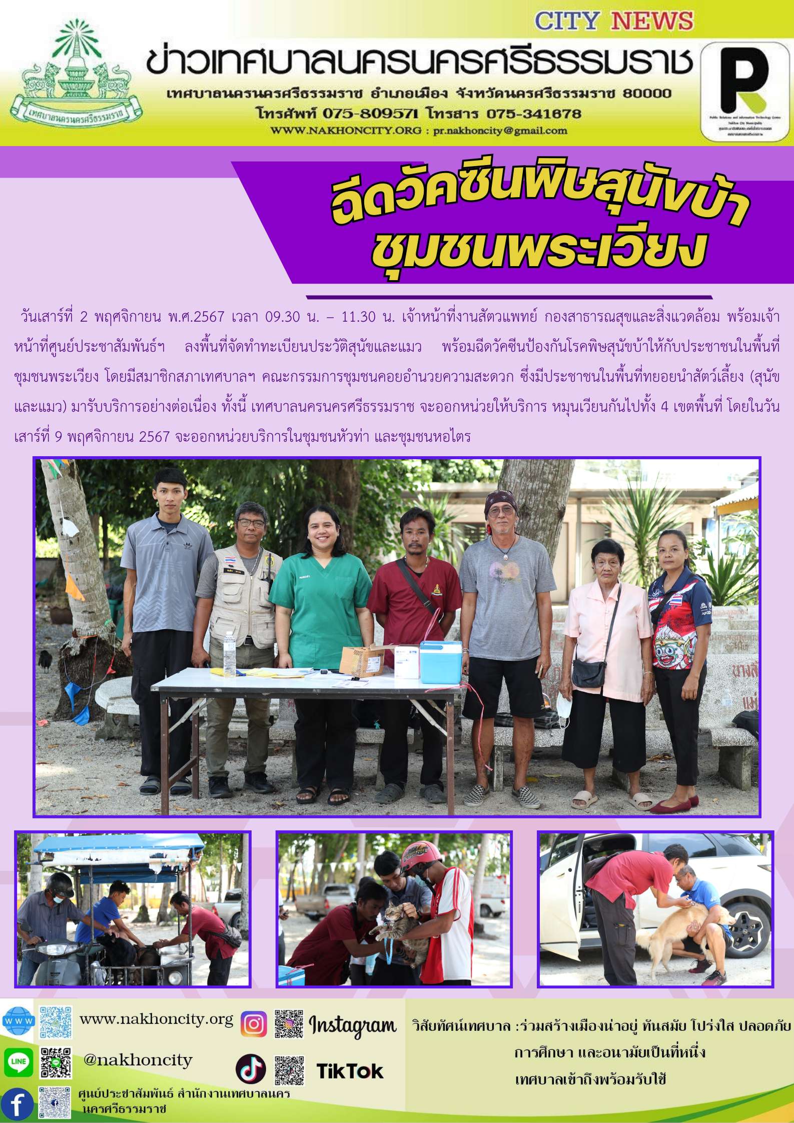 | วันเสาร์ที่ 2 พฤศจิกายน พ.ศ.2567 เวลา 09.30 น. – 11.30 น. เจ้าหน้าที่งานสัตวแพทย์ กองสาธารณสุขและสิ่งแวดล้อม พร้อมเจ้าหน้าที่ศูนย์ประชาสัมพันธ์ฯ ลงพื้นที่จัดทำทะเบียนประวัติสุนัขและแมว พร้อมฉีดวัคซีนป้องกันโรคพิษสุนัขบ้าให้กับประชาชนในพื้นที่ชุมชนพระเวียง โดยมีสมาชิกสภาเทศบาลฯ คณะกรรมการชุมชนคอยอำนวยความสะดวก ซึ่งมีประชาชนในพื้นที่ทยอยนำสัตว์เลี้ยง (สุนัขและแมว) มารับบริการอย่างต่อเนื่อง ทั้งนี้ เทศบาลนครนครศรีธรรมราช จะออกหน่วยให้บริการ หมุนเวียนกันไปทั้ง 4 เขตพื้นที่ โดยในวันเสาร์ที่ 9 พฤศจิกายน 2567 จะออกหน่วยบริการในชุมชนหัวท่า และชุมชนหอไตร |