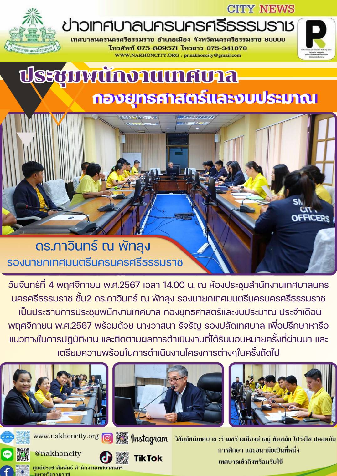 | ดร.ภาวินทร์ ณ พัทลุง รองนายกเทศมนตรีนครนครศรีธรรมราช เป็นประธานการประชุมพนักงานเทศบาล กองยุทธศาสตร์และงบประมาณ |