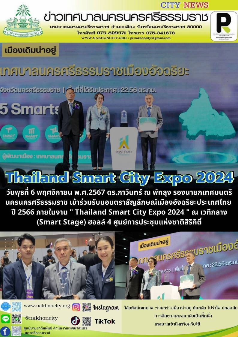 | วันพุธที่ 6 พฤศจิกายน พ.ศ.2567 ดร.ภาวินทร์ ณ พัทลุง รองนายกเทศมนตรีนครนครศรีธรรมราช เข้าร่วมรับมอบตราสัญลักษณ์เมืองอัจฉริยะประเทศไทย ปี 2566 ภายในงาน " Thailand Smart City Expo 2024 " ณ เวทีกลาง (Smart Stage) ฮอลล์ 4 ศูนย์การประชุมแห่งชาติสิริกิติ์ |