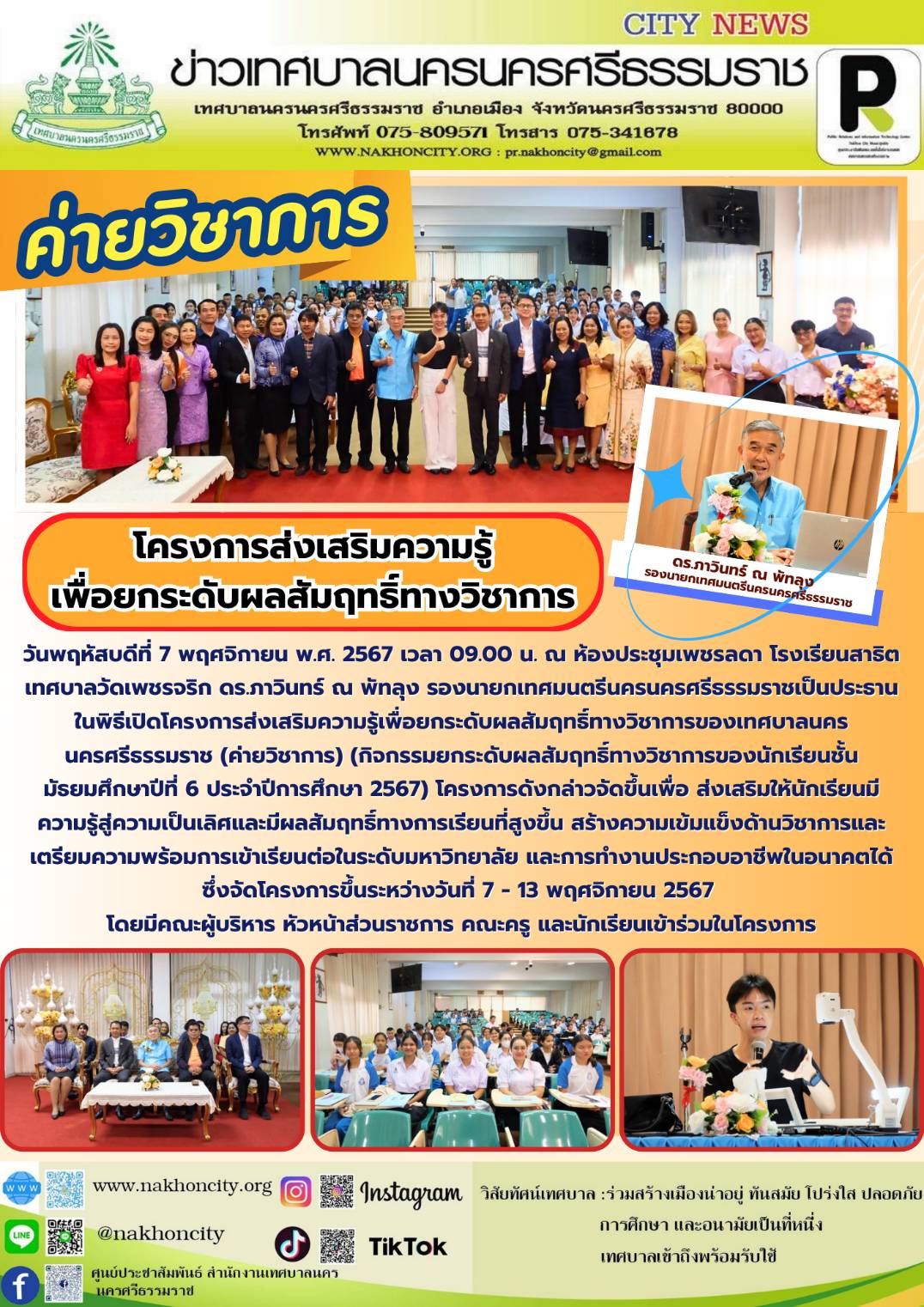 | วันพฤหัสบดีที่ 7 พฤศจิกายน พ.ศ. 2567 เวลา 09.00 น. ณ ห้องประชุมเพชรลดา โรงเรียนสาธิตเทศบาลวัดเพชรจริก ดร.ภาวินทร์ ณ พัทลุง รองนายกเทศมนตรีนครนครศรีธรรมราชเป็นประธานในพิธีเปิดโครงการส่งเสริมความรู้เพื่อยกระดับผลสัมฤทธิ์ทางวิชาการของเทศบาลนครนครศรีธรรมราช (ค่ายวิชาการ) (กิจกรรมยกระดับผลสัมฤทธิ์ทางวิชาการของนักเรียนชั้นมัธยมศึกษาปีที่ 6 ประจำปีการศึกษา 2567) โครงการดังกล่าวจัดขึ้นเพื่อ ส่งเสริมให้นักเรียนมีความรู้สู่ความเป็นเลิศและมีผลสัมฤทธิ์ทางการเรียนที่สูงขึ้น สร้างความเข้มแข็งด้านวิชาการและเตรียมความพร้อมการเข้าเรียนต่อในระดับมหาวิทยาลัย และการทำงานประกอบอาชีพในอนาคตได้ ซึ่งจัดโครงการขึ้นระหว่างวันที่ 7 - 13 พฤศจิกายน 2567 โดยมีคณะผู้บริหาร หัวหน้าส่วนราชการ คณะครู และนักเรียนเข้าร่วมในโครงการ …………… ภาพ//ข่าว//จันทร์จิรา |