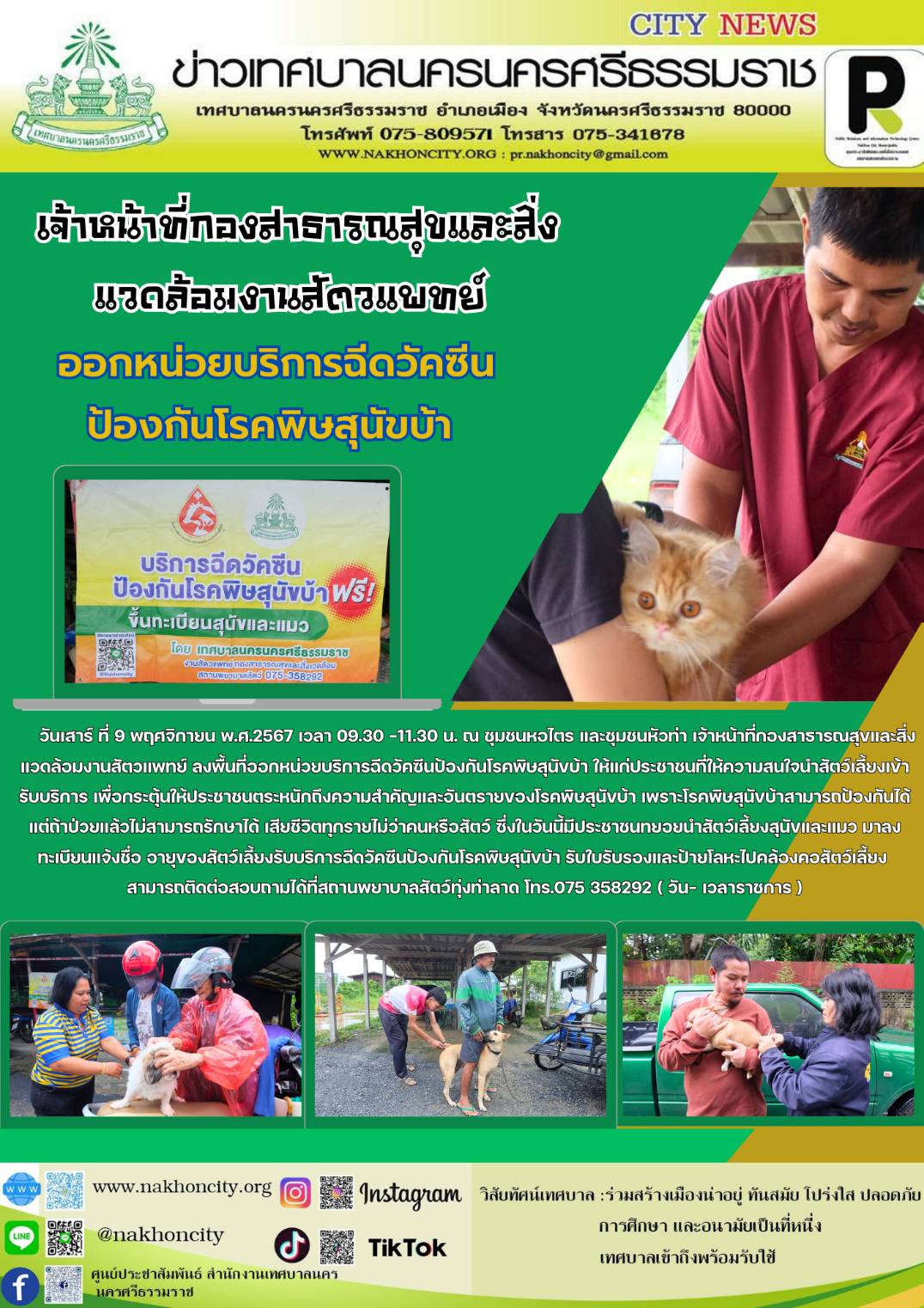 | วันเสาร์ ที่ 9 พฤศจิกายน พ.ศ.2567 เวลา 09.30 -11.30 น. ณ ชุมชนหอไตร และชุมชนหัวท่า เจ้าหน้าที่กองสาธารณสุขและสิ่งแวดล้อมงานสัตวแพทย์ ลงพื้นที่ออกหน่วยบริการฉีดวัคซีนป้องกันโรคพิษสุนัขบ้า ให้แก่ประชาชนที่ให้ความสนใจนำสัตว์เลี้ยงเข้ารับบริการ เพื่อกระตุ้นให้ประชาชนตระหนักถึงความสำคัญและอันตรายของโรคพิษสุนัขบ้า เพราะโรคพิษสุนัขบ้าสามารถป้องกันได้ แต่ถ้าป่วยแล้วไม่สามารถรักษาได้ เสียชีวิตทุกรายไม่ว่าคนหรือสัตว์ ซึ่งในวันนี้มีประชาชนทยอยนำสัตว์เลี้ยง สุนัขและแมว มาลงทะเบียนแจ้งชื่อ อายุของสัตว์เลี้ยงรับบริการฉีดวัคซีนป้องกันโรคพิษสุนัขบ้า รับใบรับรองและป้ายโลหะไปคล้องคอสัตว์เลี้ยง สามารถติดต่อสอบถามได้ที่สถานพยาบาลสัตว์ทุ่งท่าลาด โทร.075 358292 ( วัน- เวลาราชการ ) ……….. ภาพ//ข่าว//จันทร์จิรา |