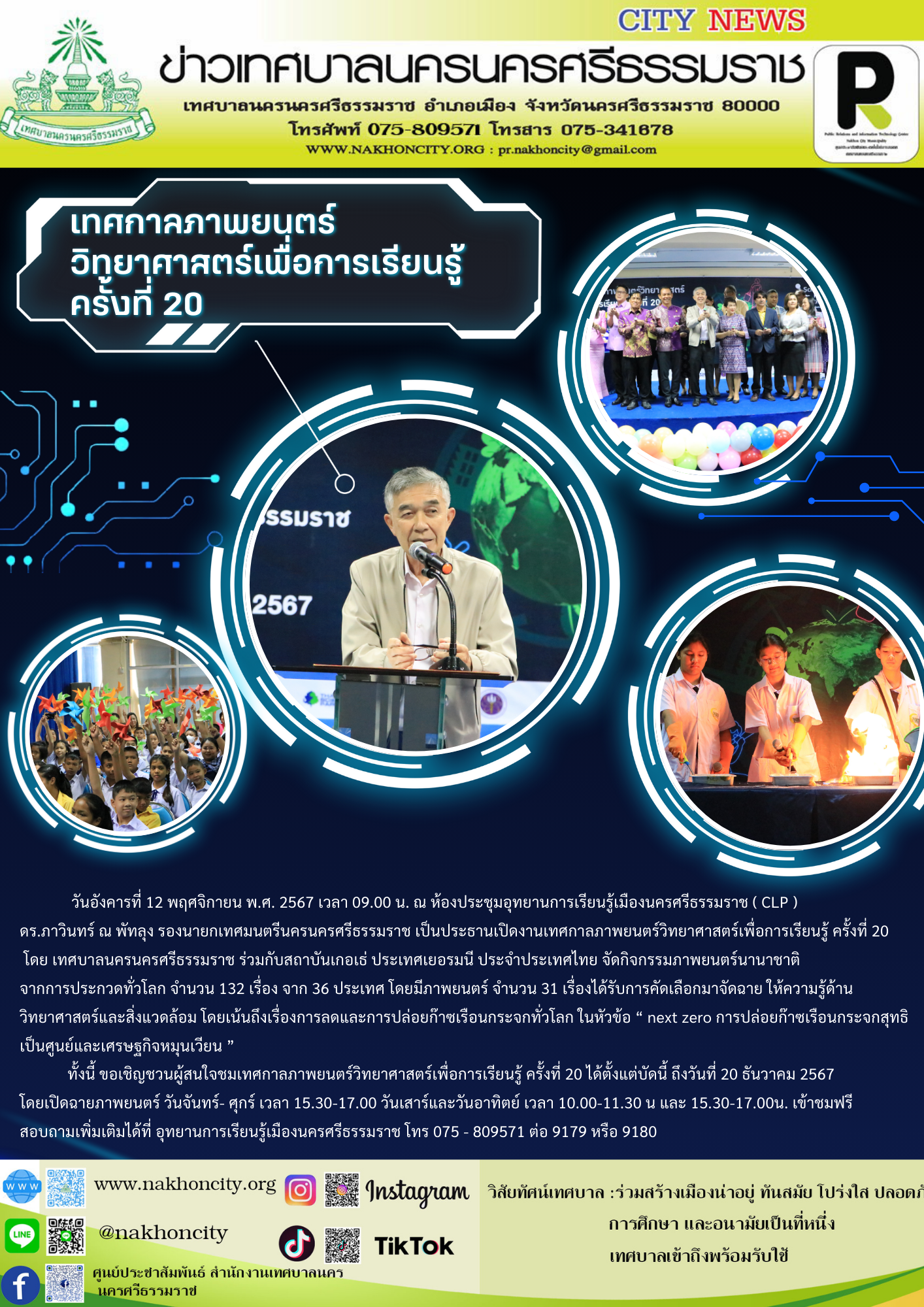 | วันอังคารที่ 12 พฤศจิกายน พ.ศ. 2567 เวลา 09.00 น. ณ ห้องประชุมอุทยานการเรียนรู้เมืองนครศรีธรรมราช ( CLP ) ดร.ภาวินทร์ ณ พัทลุง รองนายกเทศมนตรีนครนครศรีธรรมราช เป็นประธานเปิดงานเทศกาลภาพยนตร์วิทยาศาสตร์เพื่อการเรียนรู้ ครั้งที่ 20 โดย เทศบาลนครนครศรีธรรมราช ร่วมกับสถาบันเกอเธ่ ประเทศเยอรมนี ประจำประเทศไทย จัดกิจกรรมภาพยนตร์นานาชาติ จากการประกวดทั่วโลก จำนวน 132 เรื่อง จาก 36 ประเทศ โดยมีภาพยนตร์ จำนวน 31 เรื่องได้รับการคัดเลือกมาจัดฉาย ให้ความรู้ด้านวิทยาศาสตร์และสิ่งแวดล้อม โดยเน้นถึงเรื่องการลดและการปล่อยก๊าซเรือนกระจกทั่วโลก ในหัวข้อ “ next zero การปล่อยก๊าซเรือนกระจกสุทธิเป็นศูนย์และเศรษฐกิจหมุนเวียน ” ทั้งนี้ ขอเชิญชวนผู้สนใจชมเทศกาลภาพยนตร์วิทยาศาสตร์เพื่อการเรียนรู้ ครั้งที่ 20 ได้ตั้งแต่บัดนี้ ถึงวันที่ 20 ธันวาคม 2567 โดยเปิดฉายภาพยนตร์ วันจันทร์- ศุกร์ เวลา 15.30-17.00 วันเสาร์และวันอาทิตย์ เวลา 10.00-11.30น และ 15.30-17.00น. เข้าชมฟรี สอบถามเพิ่มเติมได้ที่ อุทยานการเรียนรู้เมืองนครศรีธรรมราช โทร 075 - 809571 ต่อ 9179 หรือ 9180 |