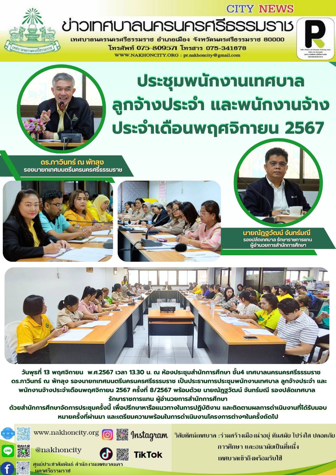 | ดร.ภาวินทร์ ณ พัทลุง รองนายกเทศมนตรีนครนครศรีธรรมราช เป็นประธานการประชุมพนักงานเทศบาล ลูกจ้างประจำ และพนักงานจ้างประจำเดือนพฤศจิกายน 2567 |