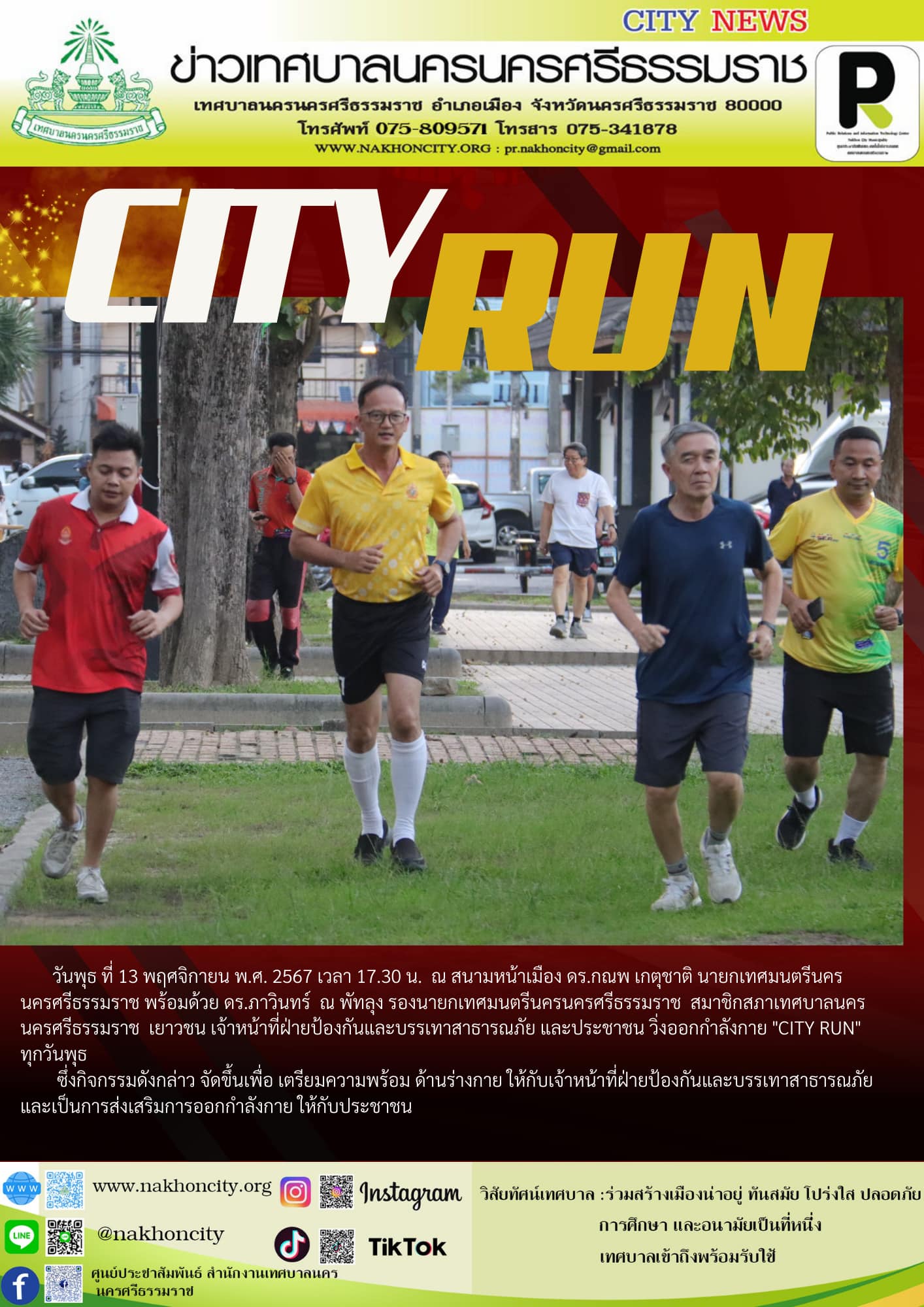 | วันพุธ ที่ 13 พฤศจิกายน พ.ศ. 2567 เวลา 17.30 น. ณ สนามหน้าเมือง ดร.กณพ เกตุชาติ นายกเทศมนตรีนครนครศรีธรรมราช พร้อมด้วย ดร.ภาวินทร์ ณ พัทลุง รองนายกเทศมนตรีนครนครศรีธรรมราช สมาชิกสภาเทศบาลนครนครศรีธรรมราช เยาวชน เจ้าหน้าที่ฝ่ายป้องกันและบรรเทาสาธารณภัย และประชาชน วิ่งออกกำลังกาย "CITY RUN" ทุกวันพุธ ซึ่งกิจกรรมดังกล่าว จัดขึ้นเพื่อ เตรียมความพร้อม ด้านร่างกาย ให้กับเจ้าหน้าที่ฝ่ายป้องกันและบรรเทาสาธารณภัย และเป็นการส่งเสริมการออกกำลังกาย ให้กับประชาชน |