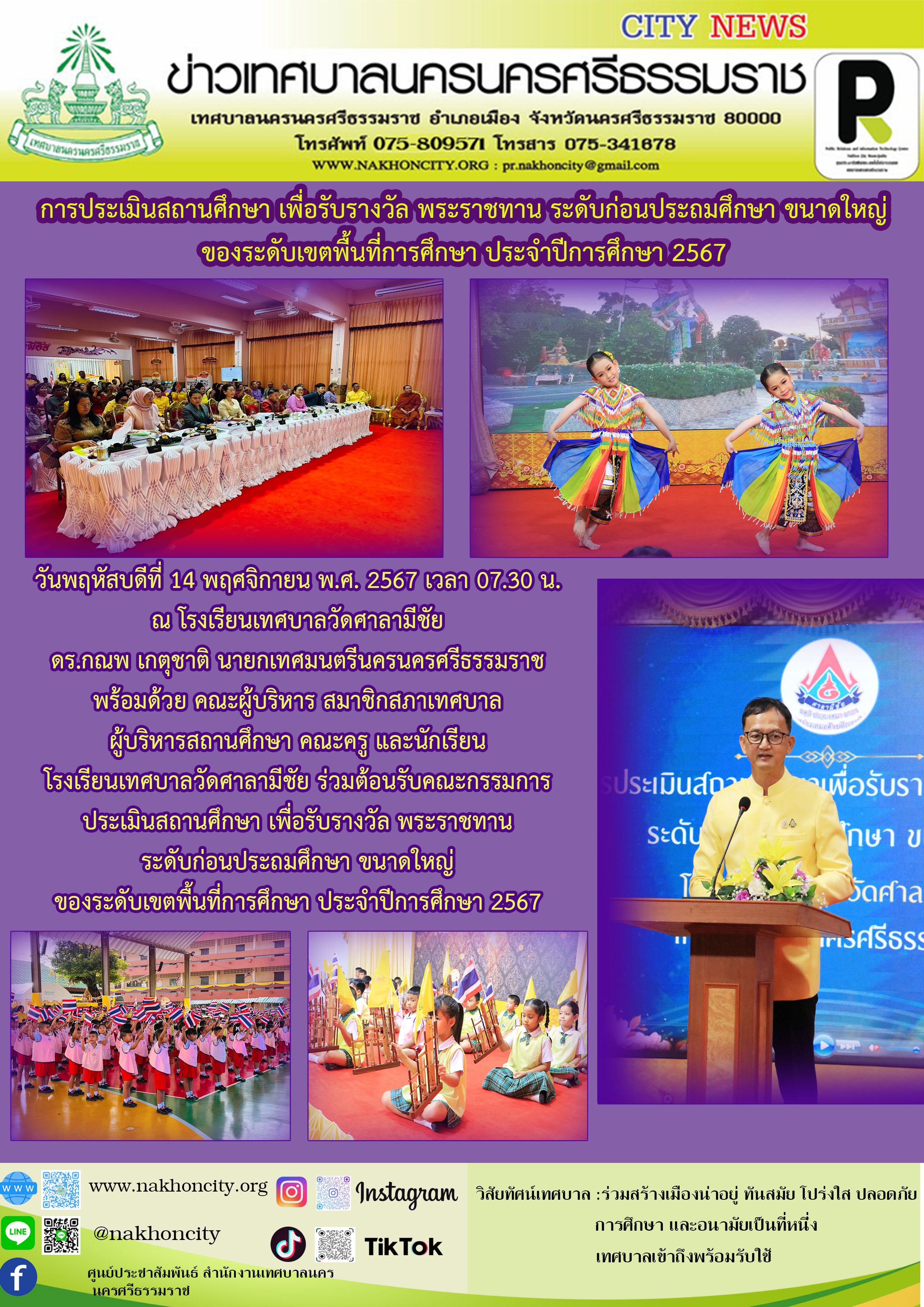 | นายกเทศมนตรีนครนครศรีธรรมราช ต้อนรับคณะกรรมการประเมินสถานศึกษา เพื่อรับรางวัล พระราชทาน ระดับก่อนประถมศึกษา ขนาดใหญ่ ของระดับเขตพื้นที่การศึกษา ประจำปีการศึกษา 2567 |