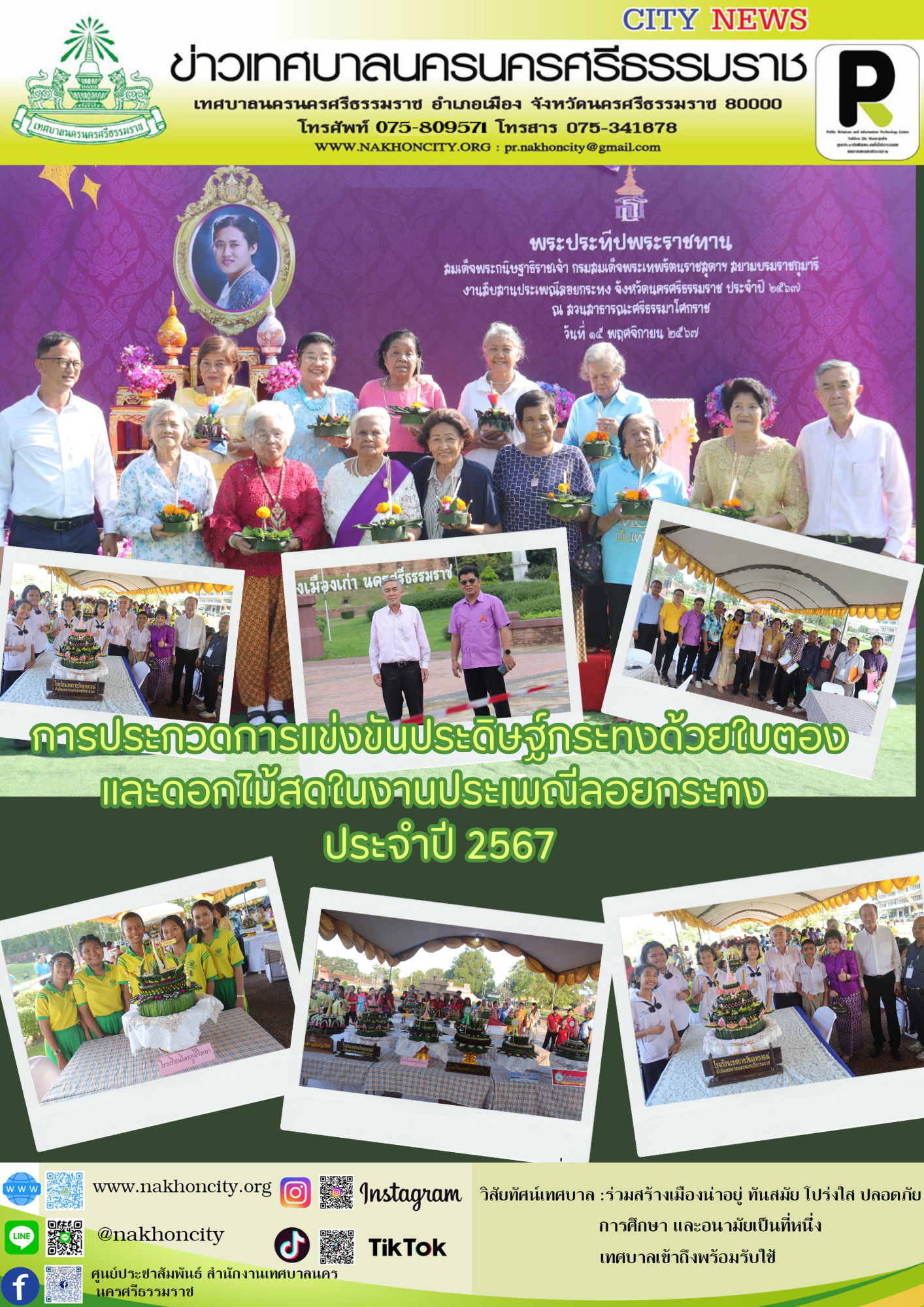 | การประกวดการแข่งขันประดิษฐ์กระทงด้วยใบตองและดอกไม้สดในงานประเพณีลอยกระทง ประจำปี 2567 วันศุกร์ ที่ 15 พฤศจิกายน พ.ศ.2567 เวลา 18.00 น. ณ สวนสาธารณะศรีธรรมาโศกราช คณะผู้บริหารเทศบาล หัวหน้าส่วนราชการ และผู้บริหารสถานศึกษาในสังกัดเทศบาล ร่วมเป็นเกียรติในพิธีมอบรางวัลการแข่งขันประดิษฐ์กระทงด้วยใบตองและดอกไม้สด ในงานประเพณีลอยกระทง ประจำปี 2567 จัดโดยสำนักการศึกษา เทศบาลนครนครศรีธรรมราช สรุปผลการประกวดดังนี้ กลุ่มนักเรียนประถมศึกษาปลาย ป.4 - ป.6 1. รางวัลชนะเลิศ ได้แก่ โรงเรียนเทศบาลวัดท้าวโคตรรับเงินสด 5,000 บาท พร้อมเกียรติบัตร 2. รางวัลรองชนะเลิศอันดับ 1 ได้แก่ โรงเรียนเทศบาลวัดมเหยงคณ์ รับเงินสด 4,000 บาท พร้อมเกียรติบัตร 3. รางวัลรองขนะเลิศอันดับ 2 ได้แก่ โรงเรียนวัดใหญ่ รับเงินสด 3,000 บาท พร้อมเกียรติบัตร 4. รางวัลรองชนะเลิศอันดับ 3 ได้แก่ โรงเรียนเทศบาลวัดเสมาเมือง รับเงินสด 2,000 บาท พร้อมเกียรติบัตร
