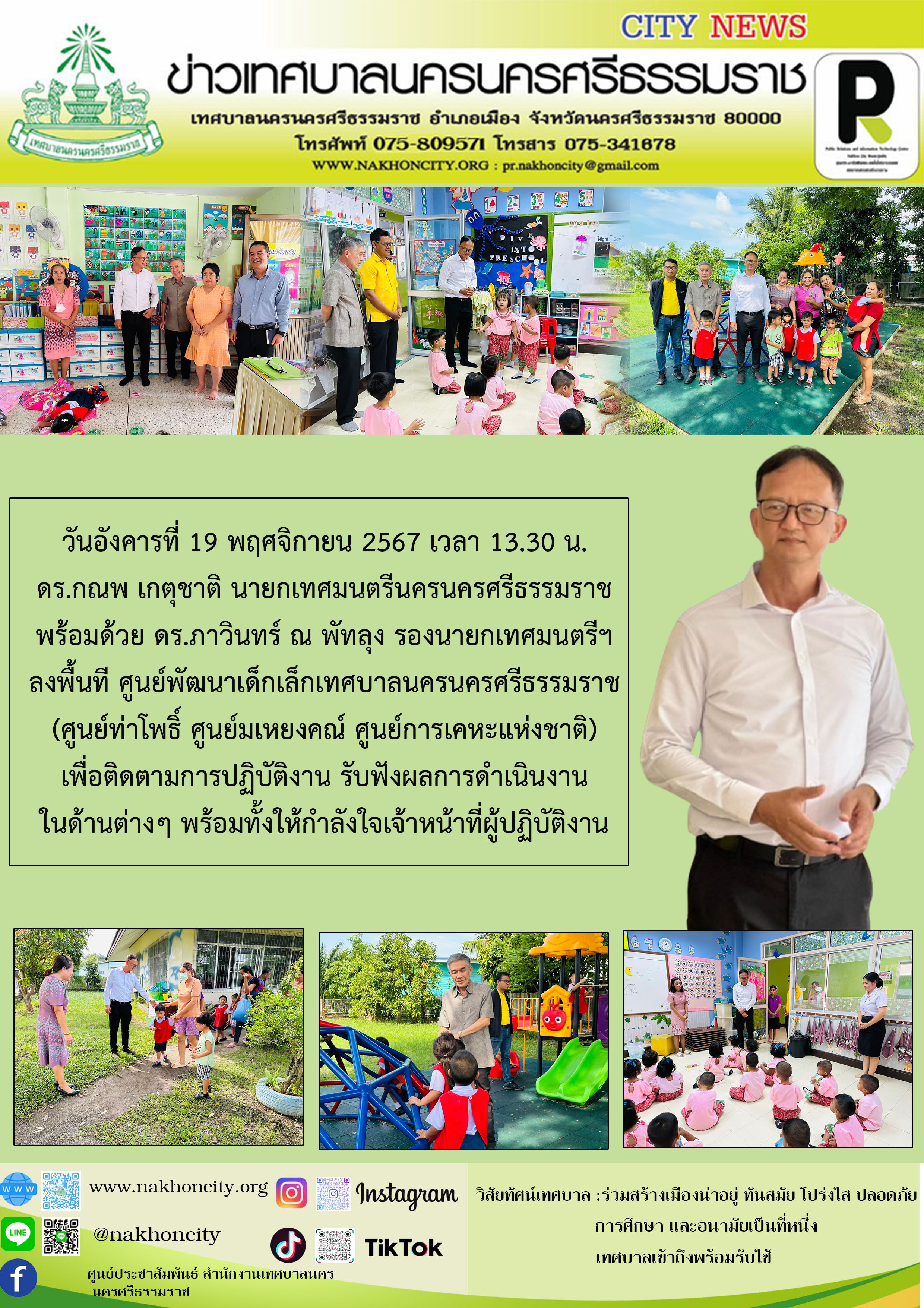 | วันอังคารที่ 19 พฤศจิกายน 2567 เวลา 13.30 น. ดร.กณพ เกตุชาติ นายกเทศมนตรีนครนครศรีธรรมราช พร้อมด้วย ดร.ภาวินทร์ ณ พัทลุง รองนายกเทศมนตรีฯ ลงพื้นที ศูนย์พัฒนาเด็กเล็กเทศบาลนครนครศรีธรรมราช (ศูนย์ท่าโพธิ์ ศูนย์มเหยงคณ์ ศูนย์การเคหะแห่งชาติ) เพื่อติดตามการปฏิบัติงาน รับฟังผลการดำเนินงานในด้านต่างๆ พร้อมทั้งให้กำลังใจเจ้าหน้าที่ผู้ปฏิบัติงาน
