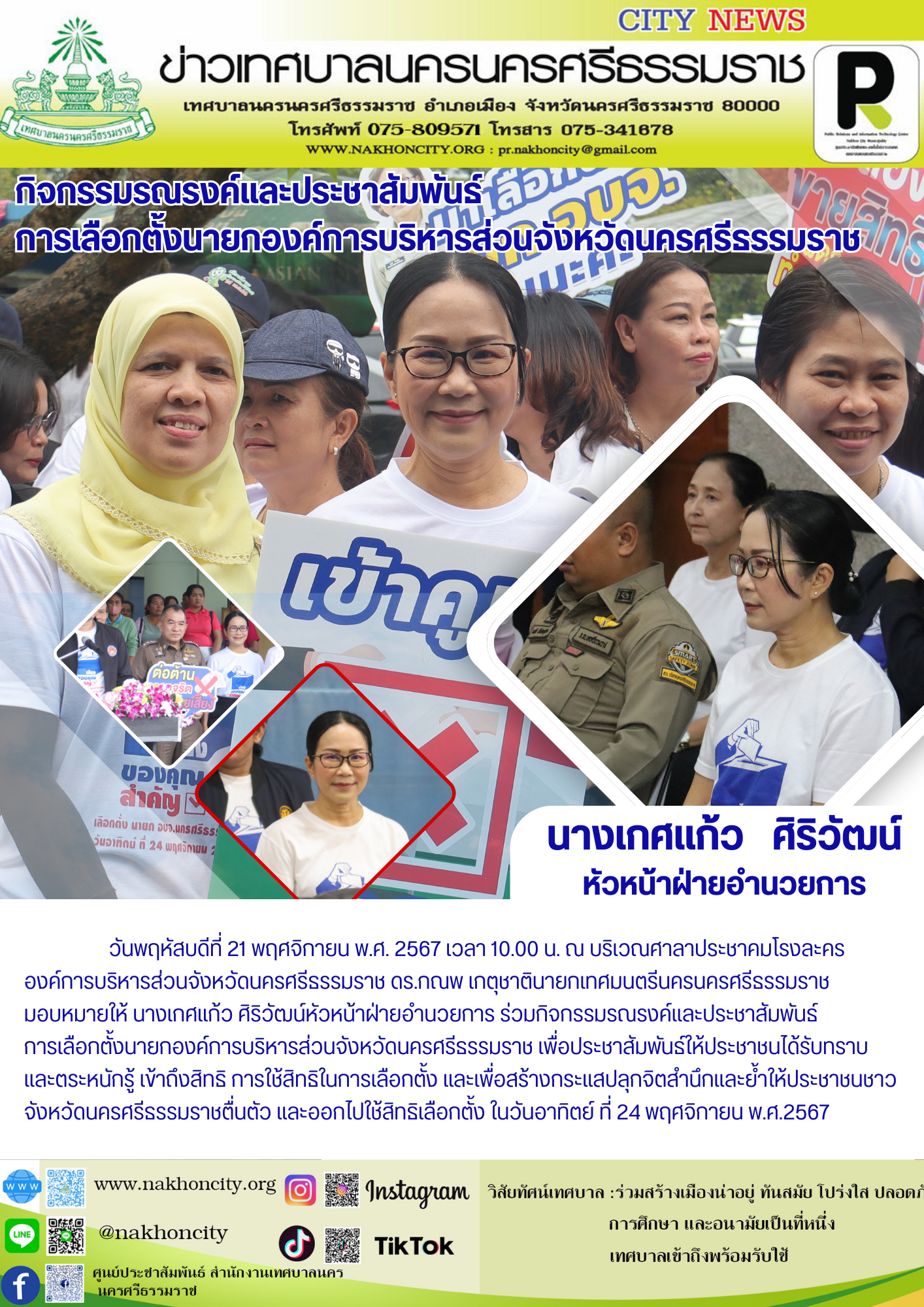 | นางเกศแก้ว ศิริวัฒน์ หัวหน้าฝ่ายอำนวยการ ร่วมกิจกรรมรณรงค์และประชาสัมพันธ์การเลือกตั้งนายกองค์การบริหารส่วนจังหวัดนครศรีธรรมราช |