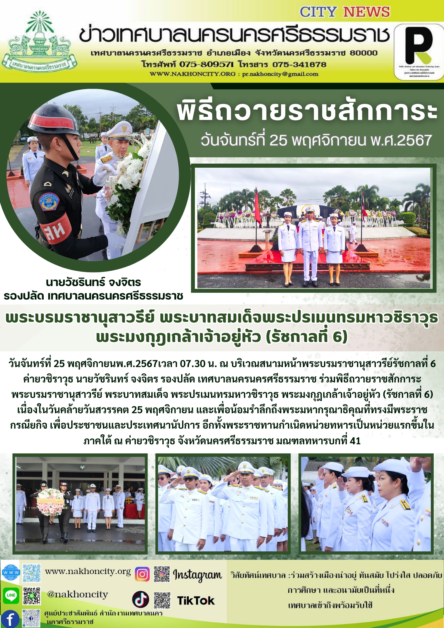 | วันจันทร์ที่ 25 พฤศจิกายน  พ.ศ.2567  เวลา 07.30 น. ณ บริเวณสนามหน้าพระบรมราชานุสาวรีย์รัชกาลที่ 6 ค่ายวชิราวุธ นายวัชรินทร์ จงจิตร รองปลัด เทศบาลนครนครศรีธรรมราช ร่วมพิธีถวายราชสักการะพระบรมราชานุสาวรีย์ พระบาทสมเด็จ พระปรเมนทรมหาวชิราวุธ พระมงกุฎเกล้าเจ้าอยู่หัว (รัชกาลที่ 6) เนื่องในวันคล้ายวันสวรรคต 25 พฤศจิกายน และเพื่อน้อมรำลึกถึงพระมหากรุณาธิคุณที่ทรงมีพระราชกรณียกิจ เพื่อประชาชนและประเทศนานัปการ อีกทั้งพระราชทานกำเนิดหน่วยทหารเป็นหน่วยแรกขึ้นในภาคใต้ ณ ค่ายวชิราวุธ จังหวัดนครศรีธรรมราช มณฑลทหารบกที่ 41 |