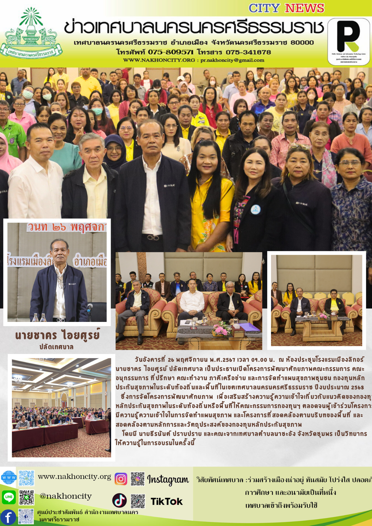 | นายชาคร ไอยศูรย์ ปลัดเทศบาล เป็นประธานเปิดโครงการพัฒนาศักยภาพคณะกรรมการ คณะอนุกรรมการ ที่ปรึกษา คณะทำงาน ภาคีเครือข่าย และการจัดทำแผนสุขภาพชุมชน กองทุนหลักประกันสุขภาพในระดับท้องถิ่นและพื้นที่ในเขตเทศบาลนครนครศรีธรรมราช ปีงบประมาณ 2568 |
