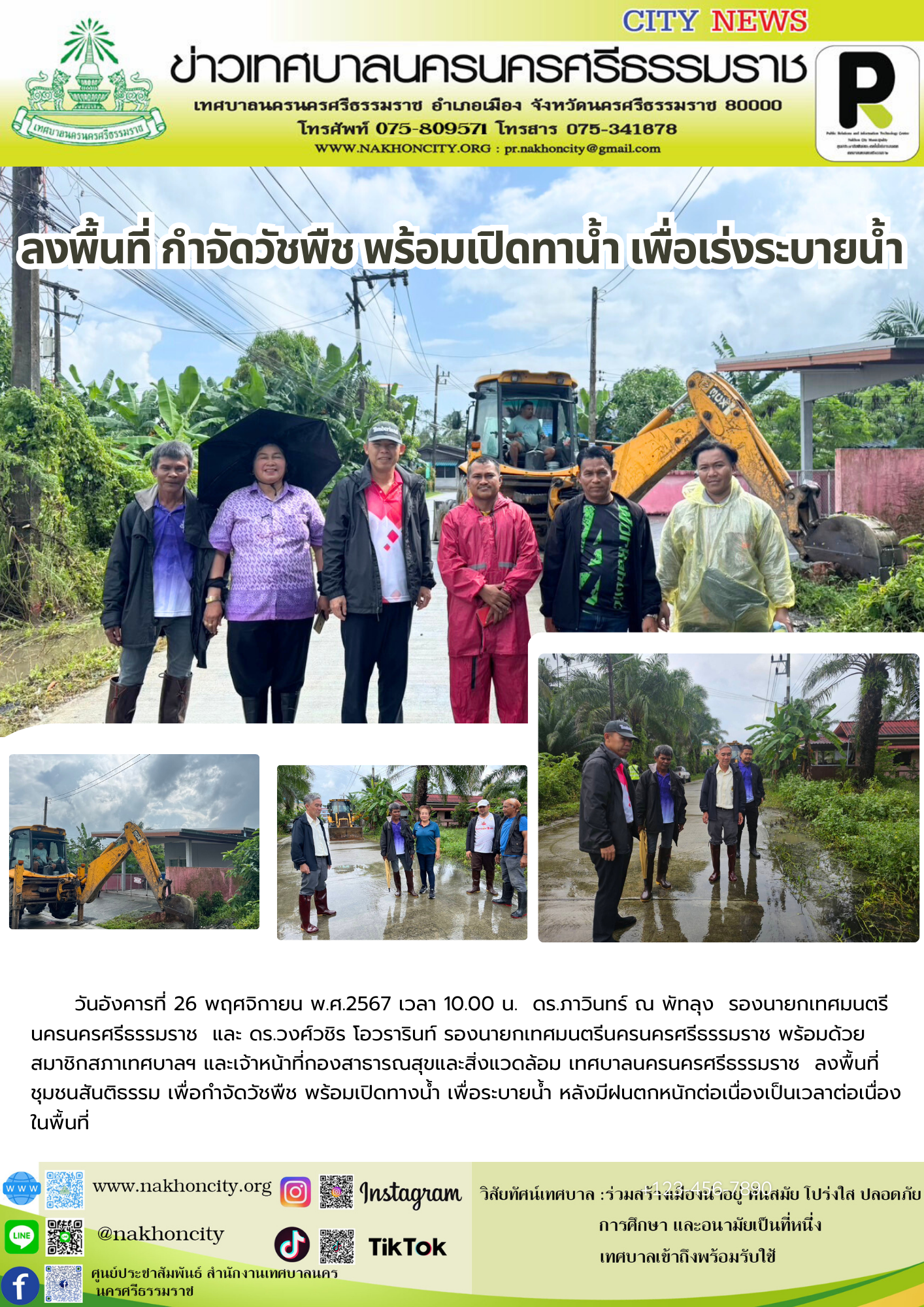 | วันอังคารที่ 26 พฤศจิกายน พ.ศ.2567 เวลา 10.00 น. ดร.ภาวินทร์ ณ พัทลุง รองนายกเทศมนตรีนครนครศรีธรรมราช และ ดร.วงศ์วชิร โอวรารินท์ รองนายกเทศมนตรีนครนครศรีธรรมราช พร้อมด้วยสมาชิกสภาเทศบาลฯ และเจ้าหน้าที่กองสาธารณสุขและสิ่งแวดล้อม เทศบาลนครนครศรีธรรมราช ลงพื้นที่ ชุมชนสันติธรรม เพื่อกำจัดวัชพืช พร้อมเปิดทางน้ำ เพื่อระบายน้ำ หลังมีฝนตกหนักต่อเนื่องเป็นเวลาต่อเนื่องในพื้นที่ ข่าว/แสงจันทร์ |