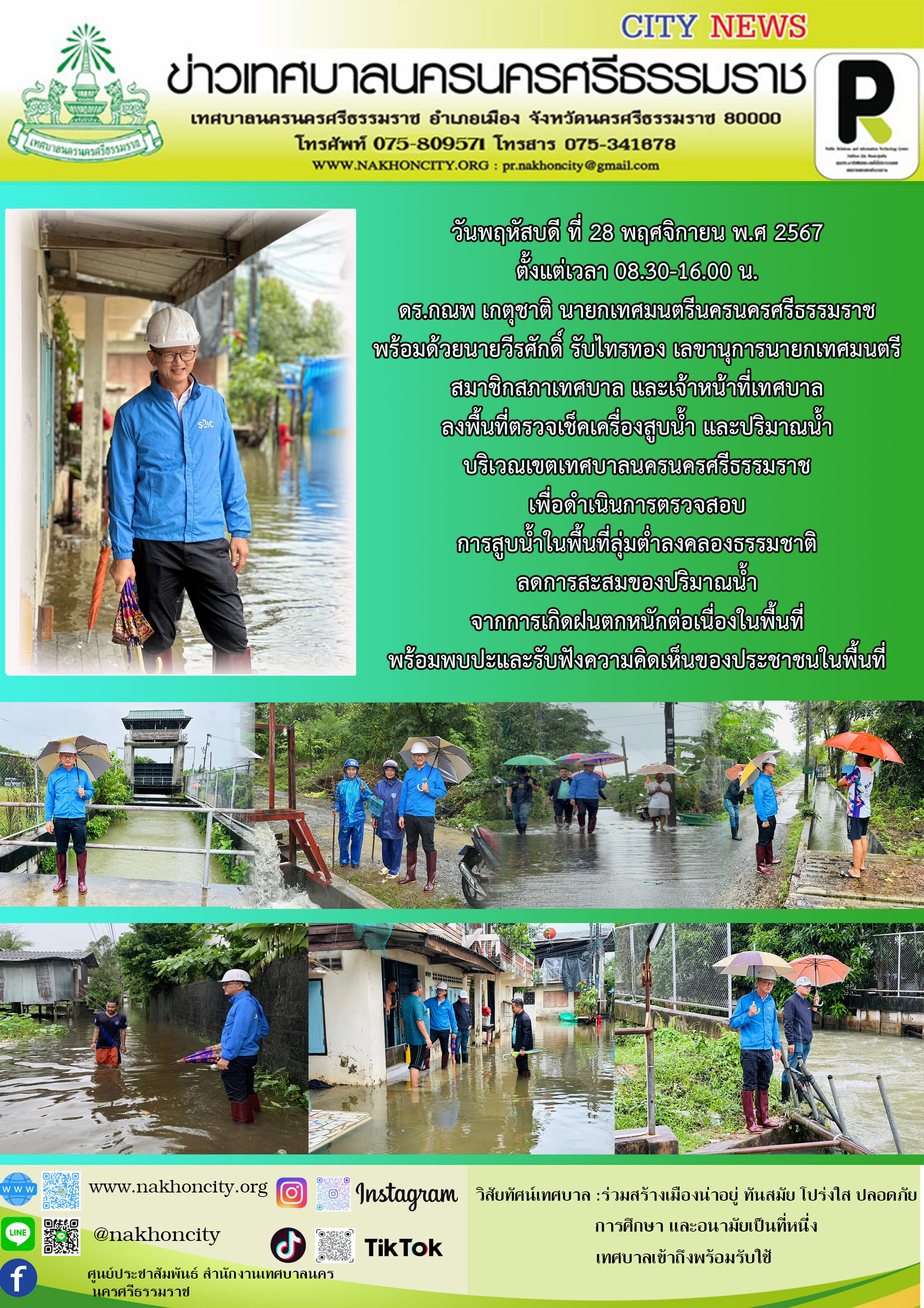 | นายกเทศมนตรีนครนครศรีธรรมราช พร้อมด้วย เลขานุการนายกเทศมนตรี สมาชิกสภาเทศบาล และเจ้าหน้าที่เทศบาล ลงพื้นที่ตรวจเช็คเครื่องสูบน้ำ และปริมาณน้ำ บริเวณเขตเทศบาลนครนครศรีธรรมราช |