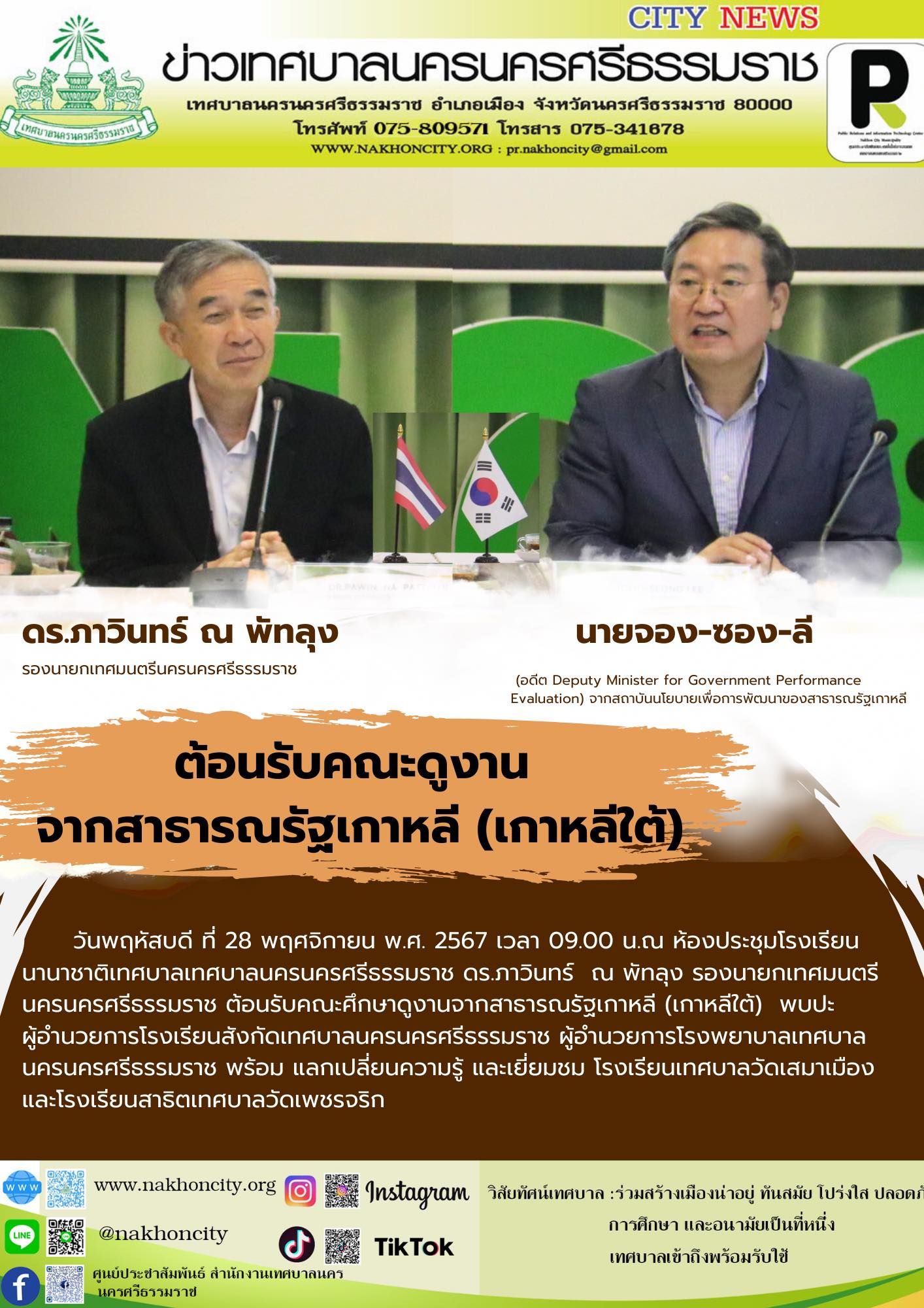| ดร.ภาวินทร์ ณ พัทลุง รองนายกเทศมนตรีนครนครศรีธรรมราช ต้อนรับคณะศึกษาดูงานจากสาธารณรัฐเกาหลี (เกาหลีใต้) |