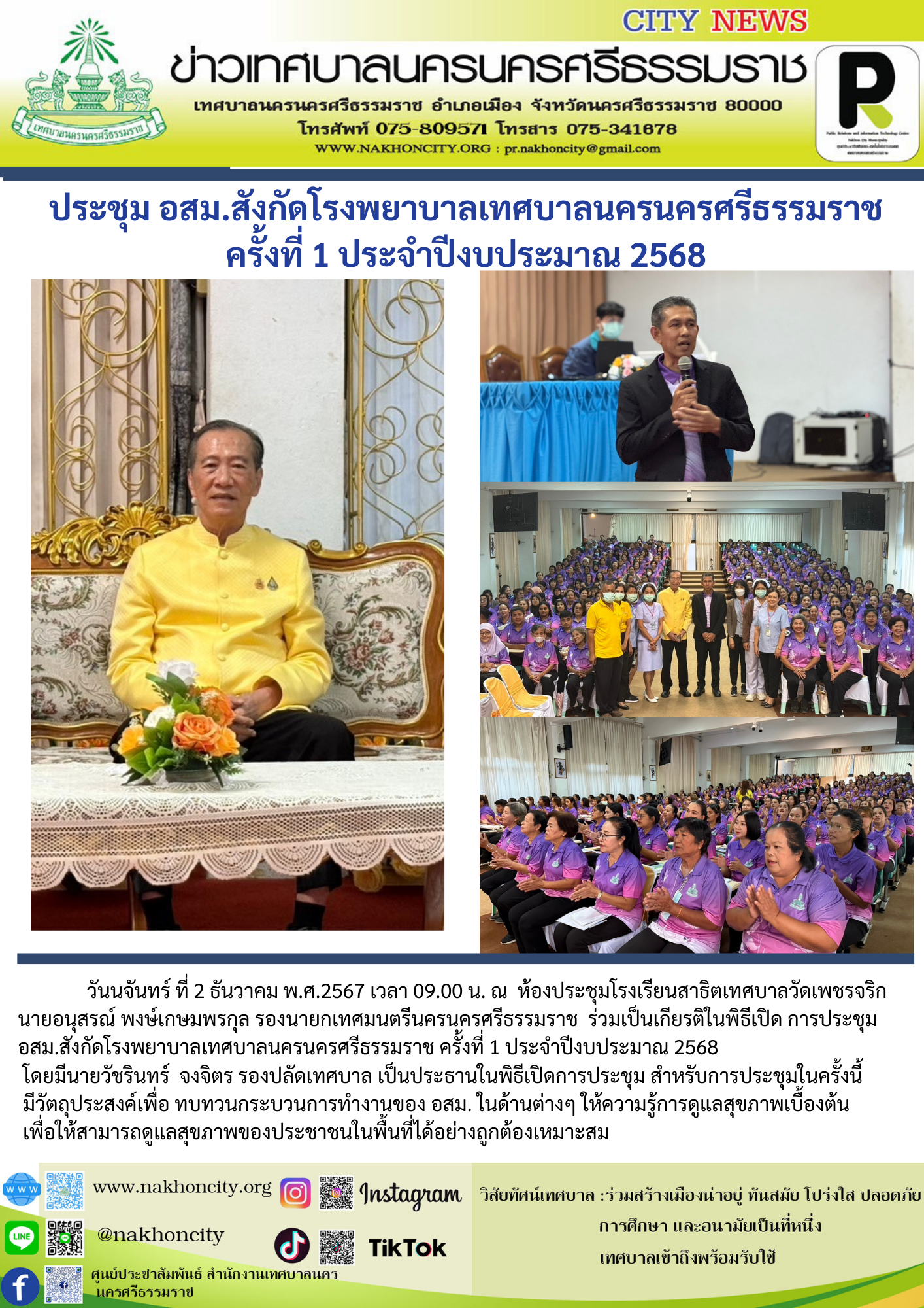 | นายอนุสรณ์ พงษ์เกษมพรกุล รองนายกเทศมนตรีนครนครศรีธรรมราช ร่วมเป็นเกียรติในพิธีเปิด การประชุม อสม.สังกัดโรงพยาบาลเทศบาลนครนครศรีธรรมราช ครั้งที่ 1 ประจำปีงบประมาณ 2568 |
