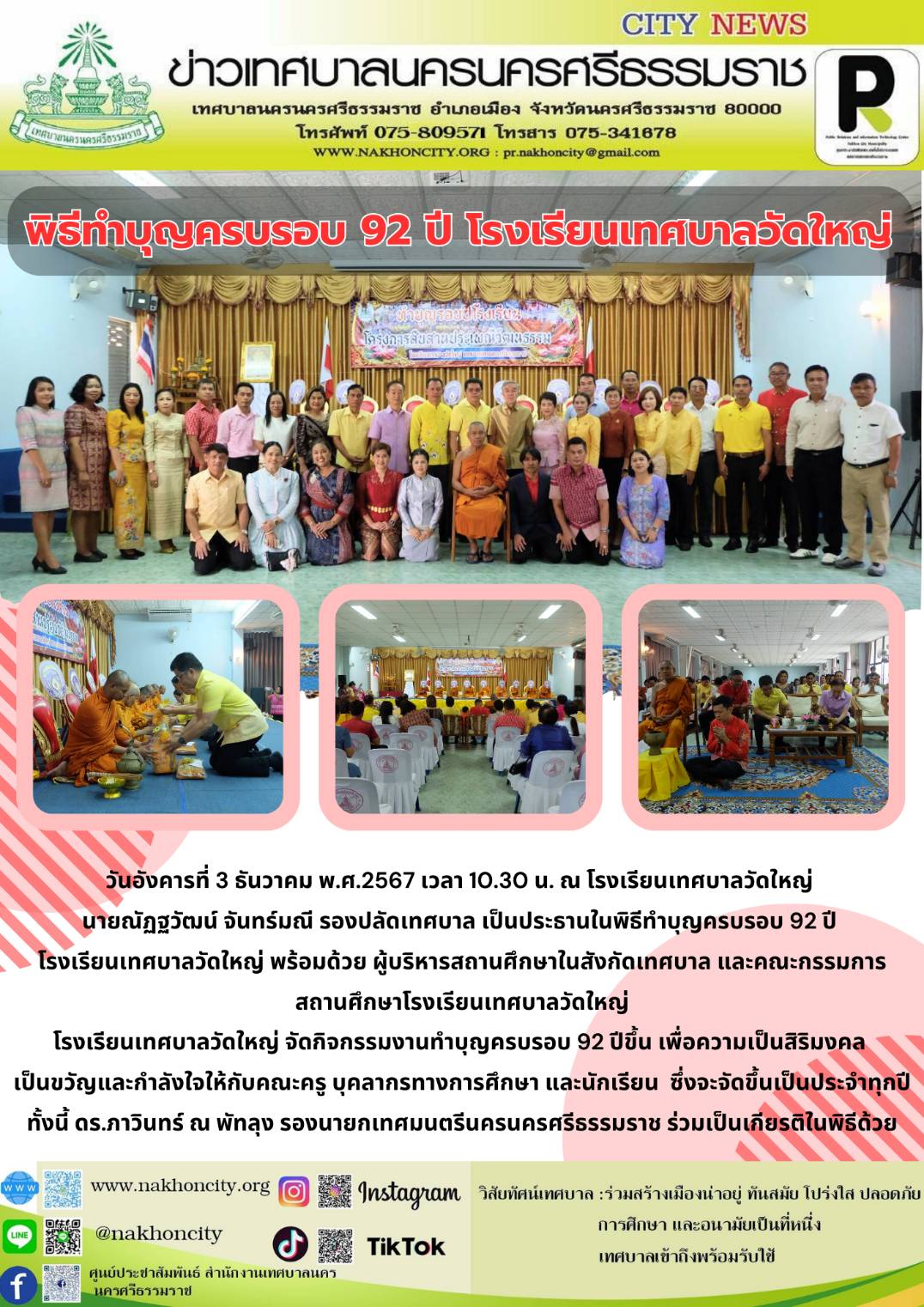 | วันอังคารที่ 3 ธันวาคม พ.ศ.2567 เวลา 10.30 น. ณ โรงเรียนเทศบาลวัดใหญ่ นายณัฏฐวัฒน์ จันทร์มณี รองปลัดเทศบาล เป็นประธานในพิธีทำบุญครบรอบ 92 ปี โรงเรียนเทศบาลวัดใหญ่ พร้อมด้วย ผู้บริหารสถานศึกษาในสังกัดเทศบาล และคณะกรรมการสถานศึกษาโรงเรียนเทศบาลวัดใหญ่ โรงเรียนเทศบาลวัดใหญ่ จัดกิจกรรมงานทำบุญครบรอบ 92 ปีขึ้น เพื่อความเป็นสิริมงคล เป็นขวัญและกำลังใจให้กับคณะครู บุคลากรทางการศึกษา และนักเรียน ซึ่งจะจัดขึ้นเป็นประจำทุกปี ทั้งนี้ ดร.ภาวินทร์ ณ พัทลุง รองนายกเทศมนตรีนครนครศรีธรรมราช ร่วมเป็นเกียรติในพิธีด้วย ................ ภาพ//ข่าว//จันทร์จิรา ตรวจทาน//ฐิตินันท์ |