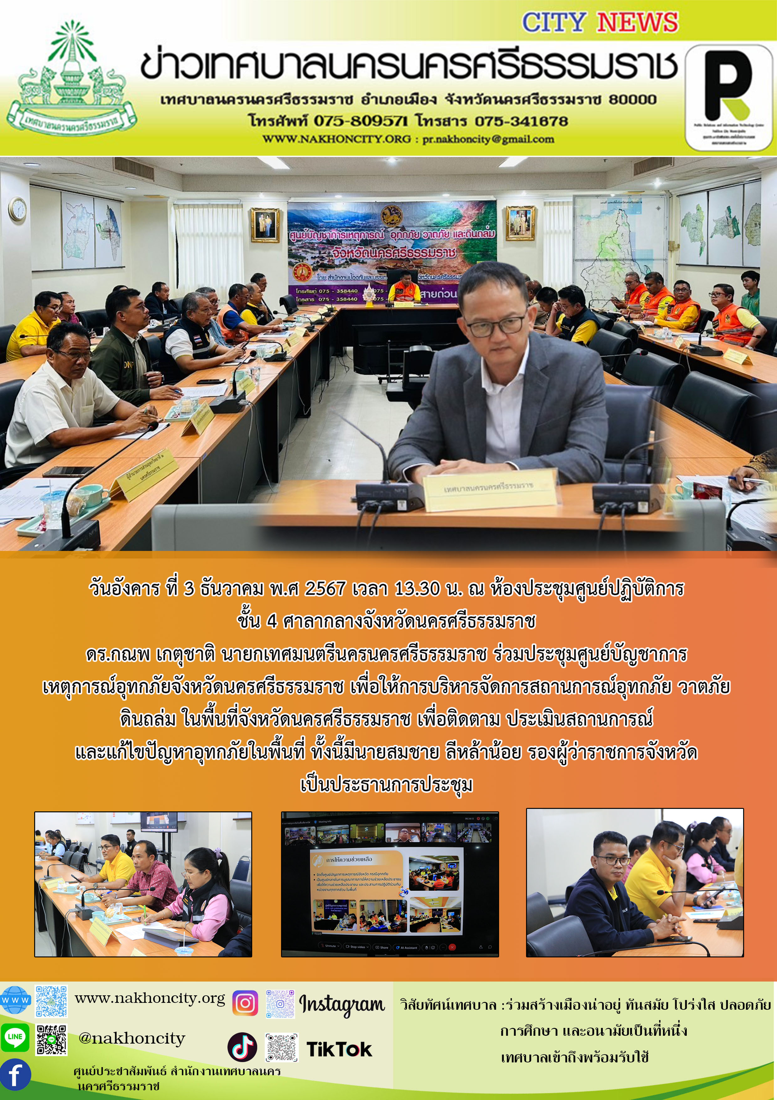 | นายกเทศมนตรีนครนครศรีธรรมราช ร่วมประชุมศูนย์บัญชาการเหตุการณ์อุทกภัยจังหวัดนครศรีธรรมราช เพื่อให้การบริหารจัดการสถานการณ์อุทกภัย วาตภัย ดินถล่ม ในพื้นที่จังหวัดนครศรีธรรมราช |
