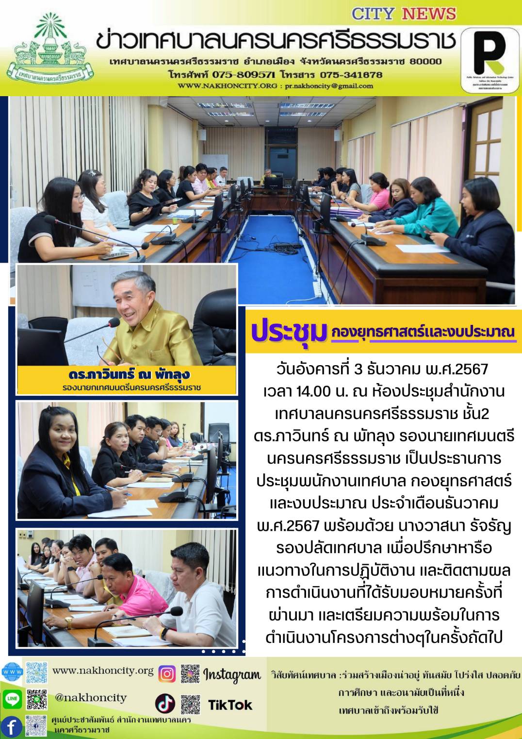| ดร.ภาวินทร์ ณ พัทลุง รองนายกเทศมนตรีนครนครศรีธรรมราช เป็นประธานการประชุมพนักงานเทศบาล กองยุทธศาสตร์และงบประมาณ |