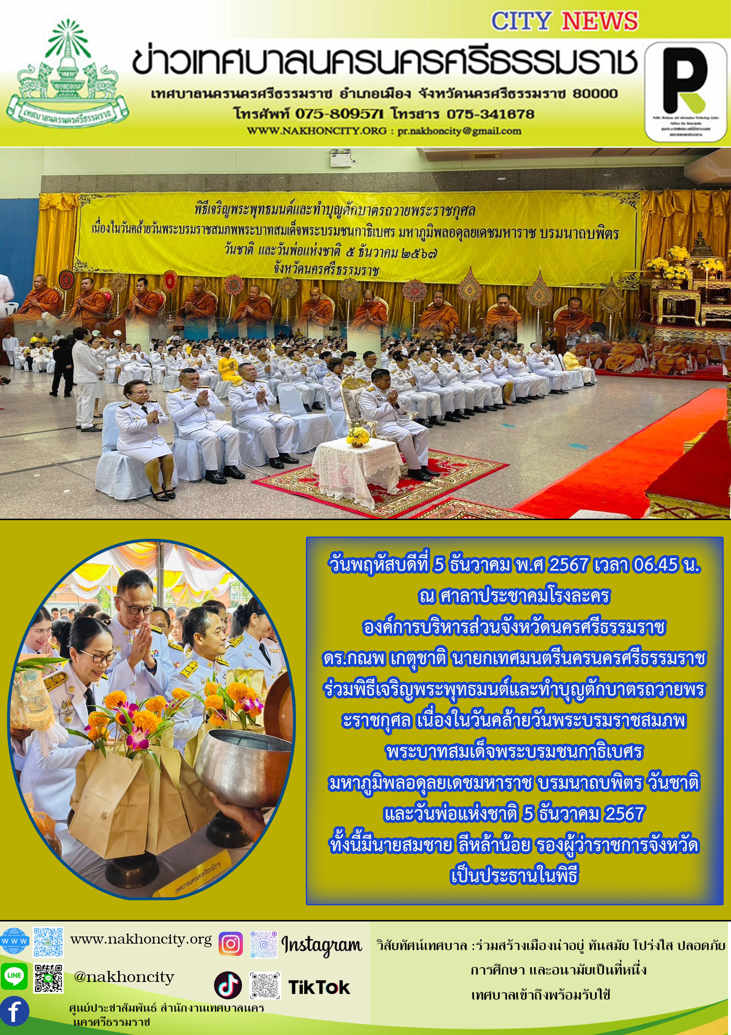| นายกเทศมนตรีนครนครศรีธรรมราช ร่วมพิธีเจริญพระพุทธมนต์และทำบุญตักบาตรถวายพระราชกุศล เนื่องในวันคล้ายวันพระบรมราชสมภพ พระบาทสมเด็จพระบรมชนกาธิเบศร มหาภูมิพลอดุลยเดชมหาราช บรมนาถบพิตร วันชาติ และวันพ่อแห่งชาติ 5 ธันวาคม 2567 |