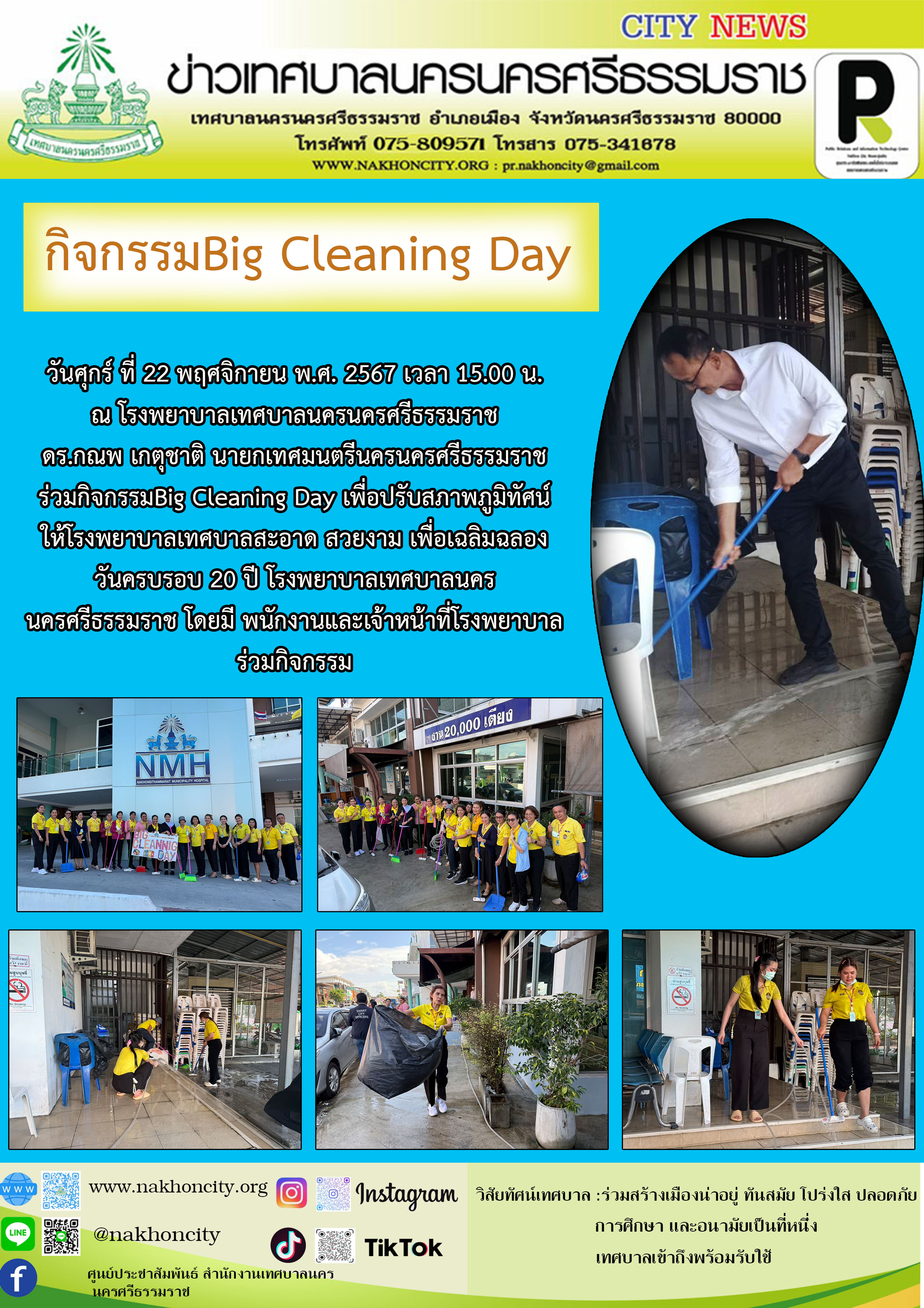 | นายกเทศมนตรีนครนครศรีธรรมราช ร่วมกิจกรรมBig Cleaning Day ปรับสภาพภูมิทัศน์ ให้โรงพยาบาลเทศบาลสะอาด สวยงาม เพื่อเฉลิมฉลอง วันครบรอบ 20 ปี โรงพยาบาลเทศบาลนครนครศรีธรรมราช |