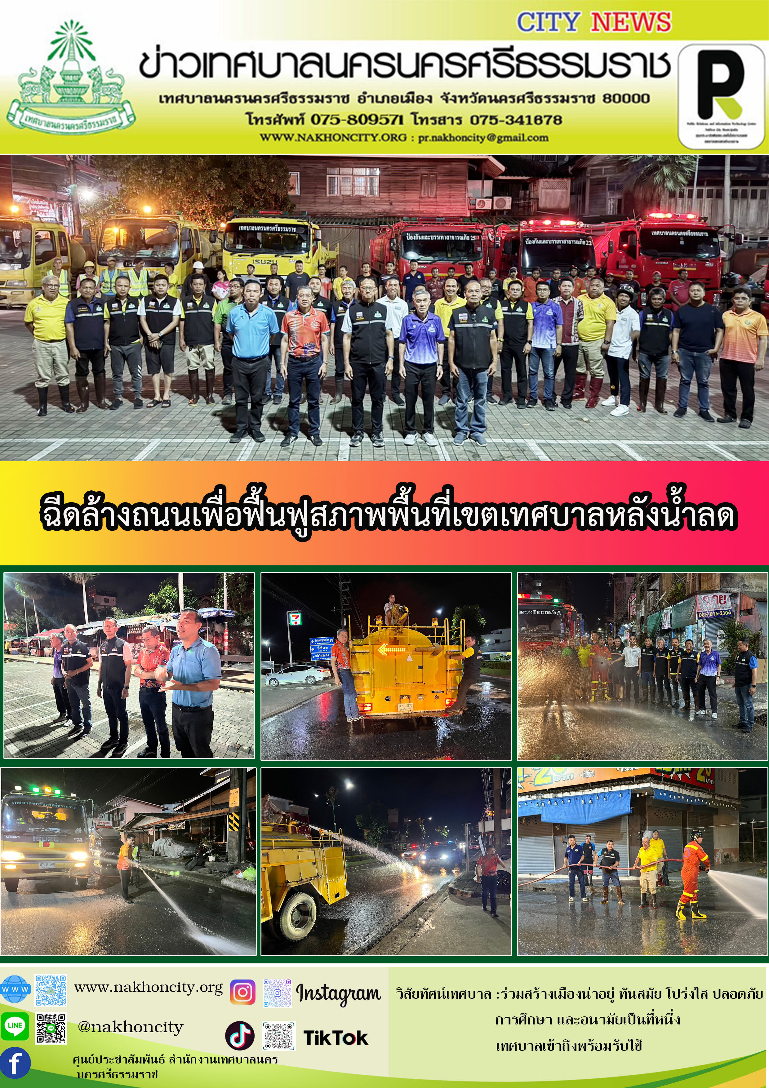 | นายกเทศมนตรีนครนครศรีธรรมราช นำคณะผู้บริหาร สมาชิกสภาเทศบาล หัวหน้าส่วนราชการ พนักงานกองสาธารณสุขและสิ่งแวดล้อม และพนักงานป้องกันและบรรเทาสาธารณภัยฉีดล้างถนนเพื่อฟื้นฟูสภาพพื้นที่เขตเทศบาลหลังน้ำลด |