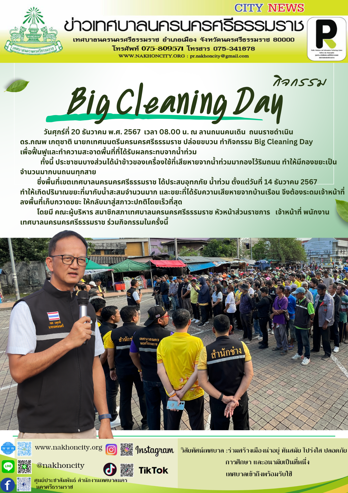 | วันศุกร์ที่ 20 ธันวาคม พ.ศ. 2567 เวลา 08.00 น. ณ ลานถนนคนเดิน ดร.กณพ เกตุชาติ นายกเทศมนตรีนครนครศรีธรรมราช ปล่อยขบวน ทำกิจกรรม Big Cleaning Day เพื่อฟื้นฟูและทำความสะอาดพื้นที่ที่ได้รับผลกระทบจากน้ำท่วม ทั้งนี้ ประชาชนบางส่วนได้นำข้าวของเครื่องใช้ที่เสียหายจากน้ำท่วมมากองไว้ริมถนน ทำให้มีกองขยะเป็นจำนวนมากบนถนนทุกสาย โดยพื้นที่เขตเทศบาลนครนครศรีธรรมราช ได้ประสบอุทกภัย น้ำท่วม ตั้งแต่วันที่ 14 ธันวาคม 2567 ทำให้เกิดปริมาณขยะที่มากับน้ำสะสมจำนวนมาก และขยะที่ได้รับความเสียหายจากบ้านเรือน จึงต้องระดมเจ้าหน้าที่ลงพื้นที่เก็บกวาดขยะ ให้กลับมาสู่สภาวะปกติโดยเร็วที่สุด โดยมี คณะผู้บริหาร สมาชิกสภาเทศบาลนครนครศรีธรรมราช หัวหน้าส่วนราชการ เจ้าหน้าที่ พนักงาน เทศบาลนครนครศรีธรรมราช ร่วมกิจกรรมในครั้งนี้ |