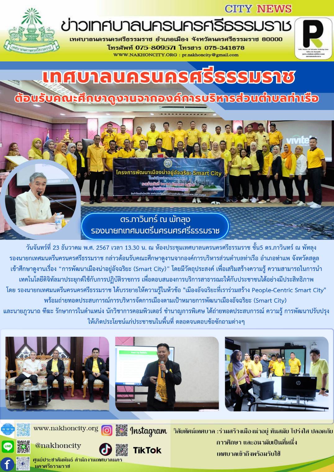 | วันจันทร์ที่ 23 ธันวาคม พ.ศ. 2567 เวลา 13.30 น. ณ ห้องประชุมเทศบาลนครนครศรีธรรมราช ชั้น5 ดร.ภาวินทร์ ณ พัทลุง รองนายกเทศมนตรีนครนครศรีธรรมราช กล่าวต้อนรับคณะศึกษาดูงานจากองค์การบริหารส่วนตำบลท่าเรือ อำเภอท่าแพ จังหวัดสตูล เข้าศึกษาดูงานเรื่อง “การพัฒนาเมืองน่าอยู่อัจฉริยะ (Smart City)” โดยมีวัตถุประสงค์ เพื่อเสริมสร้างความรู้ ความสามารถในการนำเทคโนโลยีดิจิทัลมาประยุกต์ใช้กับการปฏิบัติราชการ เพื่อตอบสนองการบริการสาธารณะให้กับประชาชนได้อย่างมีประสิทธิภาพ โดย รองนายกเทศมนตรีนครนครศรีธรรมราช ได้บรรยายให้ความรู้ในห้วข้อ "เมืองอัจฉริยะที่เราร่วมสร้าง People-Centric Smart City" พร้อมถ่ายทอดประสบการณ์การบริหารจัดการเมืองตามเป้าหมายการพัฒนาเมืองอัจฉริยะ (Smart City) และนายภูวนาถ ฑีฆะ รักษาการในตำแหน่ง นักวิชาการคอมพิวเตอร์ ชำนาญการพิเศษ ได้ถ่ายทอดประสบการณ์ ความรู้ การพัฒนาปรับปรุงให้เกิดประโยชน์แก่ประชาชนในพื้นที่ ตลอดจนตอบข้อซักถามต่างๆ ............. ภาพ//ข่าว//จันทร์จิรา |