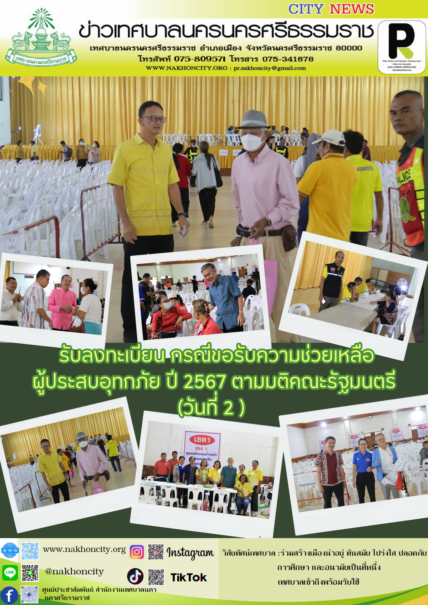 | ดร.กณพ เกตุชาติ นายกเทศมนตรีนครนครศรีธรรมราช พร้อมด้วย คณะผู้บริหารเทศบาล สมาชิกสภาเทศบาลนครนครศรีธรรมราช หัวหน้าส่วนราชการ เจ้าหน้าที่ ให้บริการ รับลงทะเบียน กรณีขอรับความช่วยเหลือผู้ประสบอุทกภัย ปี 2567 ตามมติคณะรัฐมนตรี (วันที่ 2 ) |