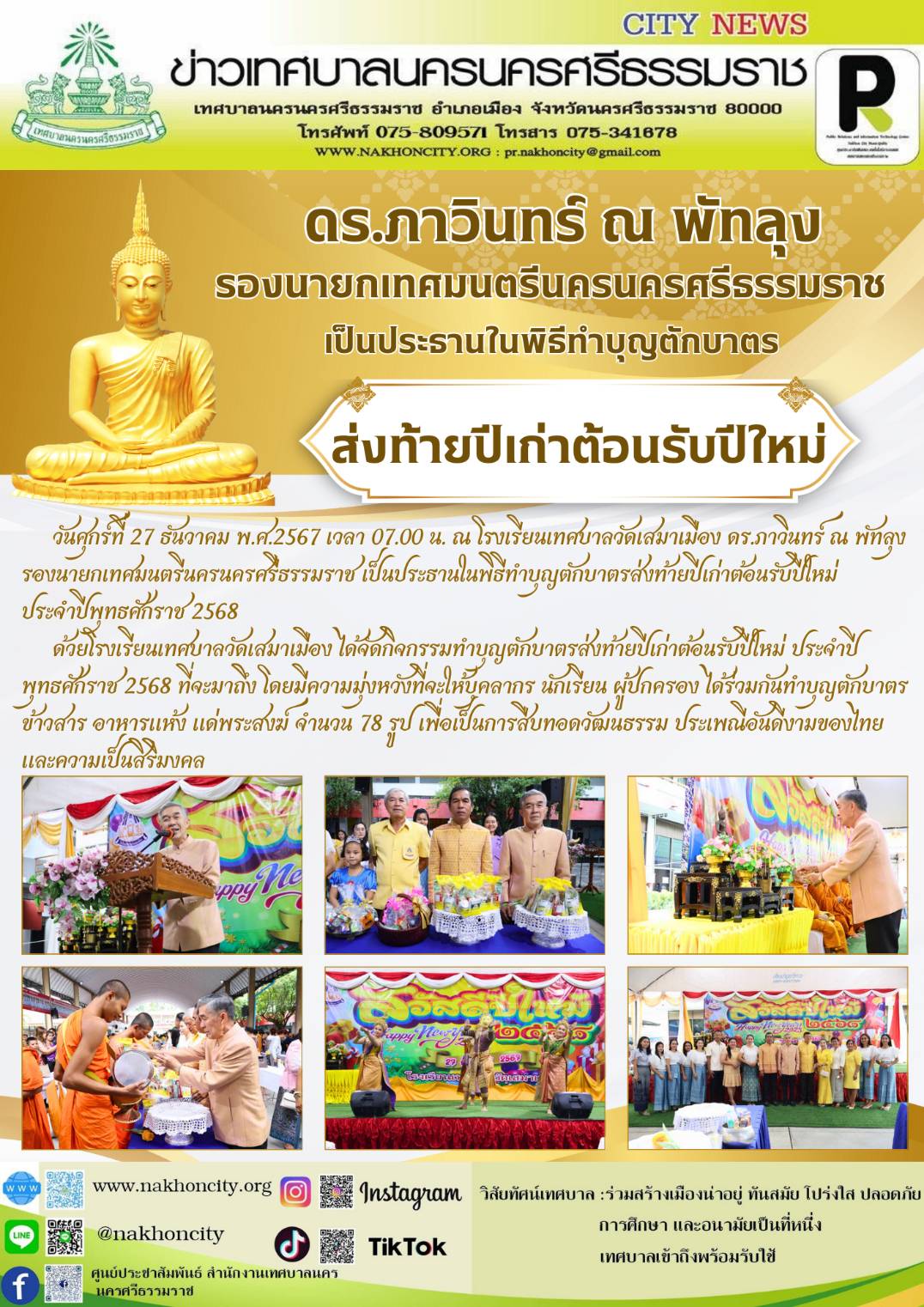 | ดร.ภาวินทร์ ณ พัทลุง รองนายกเทศมนตรีนครนครศรีธรรมราช เป็นประธานในพิธีทำบุญตักบาตรส่งท้ายปีเก่าต้อนรับปีใหม่ ประจำปีพุทธศักราช 2568 โรงเรียนเทศบาลวัดเสมาเมือง |