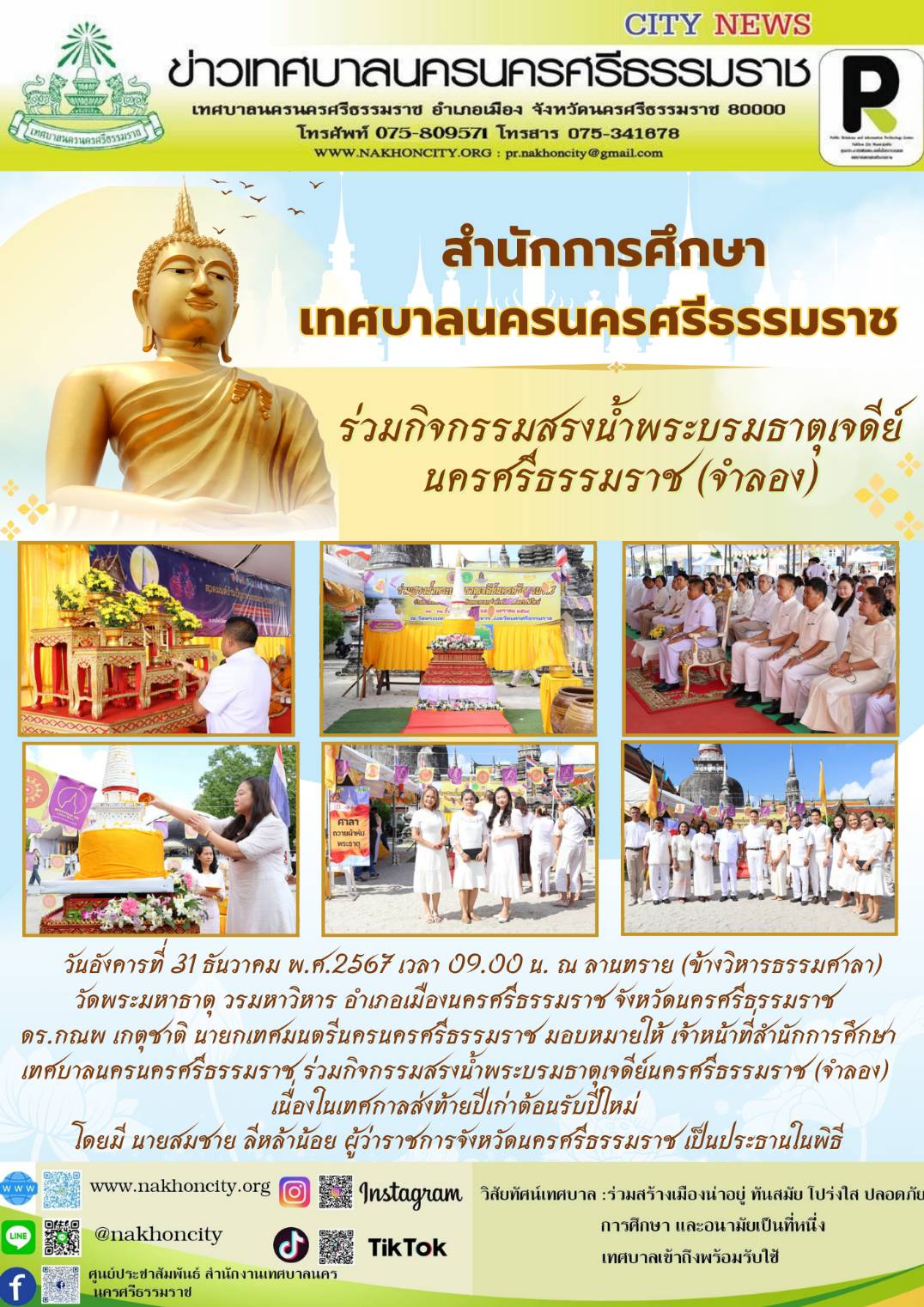 | วันอังคารที่ 31 ธันวาคม พ.ศ.2567 เวลา 09.00 น. ณ ลานทราย (ข้างวิหารธรรมศาลา) วัดพระมหาธาตุ วรมหาวิหาร อำเภอเมืองนครศรีธรรมราช จังหวัดนครศรีธรรมราช ดร.กณพ เกตุชาติ นายกเทศมนตรีนครนครศรีธรรมราช มอบหมายให้ เจ้าหน้าที่สำนักการศึกษา เทศบาลนครนครศรีธรรมราช ร่วมกิจกรรมสรงน้ำพระบรมธาตุเจดีย์นครศรีธรรมราช (จำลอง) เนื่องในเทศกาลส่งท้ายปีเก่าต้อนรับปีใหม่ โดยมี นายสมชาย ลีหล้าน้อย ผู้ว่าราชการจังหวัดนครศรีธรรมราช เป็นประธานในพิธี ............... ภาพ//ข่าว//จันทร์จิรา |