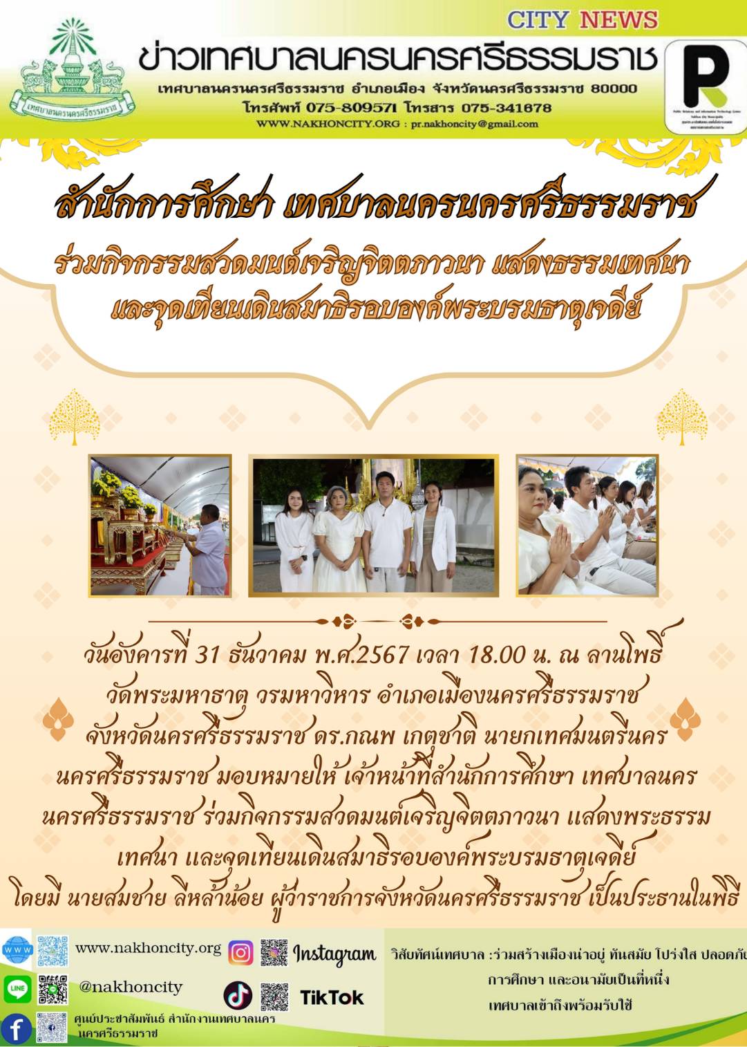 | วันอังคารที่ 31 ธันวาคม พ.ศ.2567 เวลา 18.00 น. ณ ลานโพธิ์ วัดพระมหาธาตุ วรมหาวิหาร อำเภอเมืองนครศรีธรรมราช จังหวัดนครศรีธรรมราช ดร.กณพ เกตุชาติ นายกเทศมนตรีนครนครศรีธรรมราช มอบหมายให้ เจ้าหน้าที่สำนักการศึกษา เทศบาลนครนครศรีธรรมราช ร่วมกิจกรรมสวดมนต์เจริญจิตตภาวนา แสดงพระธรรมเทศนา และจุดเทียนเดินสมาธิรอบองค์พระบรมธาตุเจดีย์ โดยมี นายสมชาย ลีหล้าน้อย ผู้ว่าราชการจังหวัดนครศรีธรรมราช เป็นประธานในพิธี .......... ภาพ//ข่าว//จันทร์จิรา |