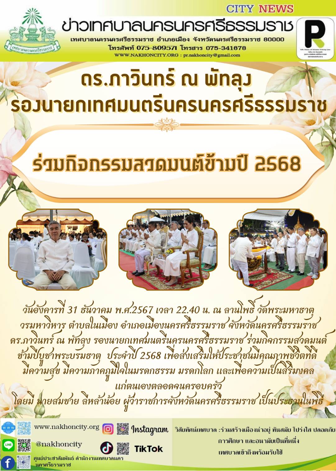 | วันอังคารที่ 31 ธันวาคม พ.ศ.2567 เวลา 22.40.น. ณ ลานโพธิ์ วัดพระมหาธาตุ วรมหาวิหาร ตำบลในเมือง อำเภอเมืองนครศรีธรรมราช จังหวัดนครศรีธรรมราช ดร.ภาวินทร์ ณ พัทลุง รองนายกเทศมนตรีนครนครศรีธรรมราช ร่วมกิจกรรมสวดมนต์ข้ามปีบูชาพระบรมธาตุ  ประจำปี 2568 เพื่อส่งเสริมให้ประชาชนมีคุณภาพชีวิตที่ดี มีความสุข มีความภาคภูมิใจในมรดกธรรม มรดกโลก และเพื่อความเป็นสิริมงคลแก่ตนเองตลอดจนครอบครัว |