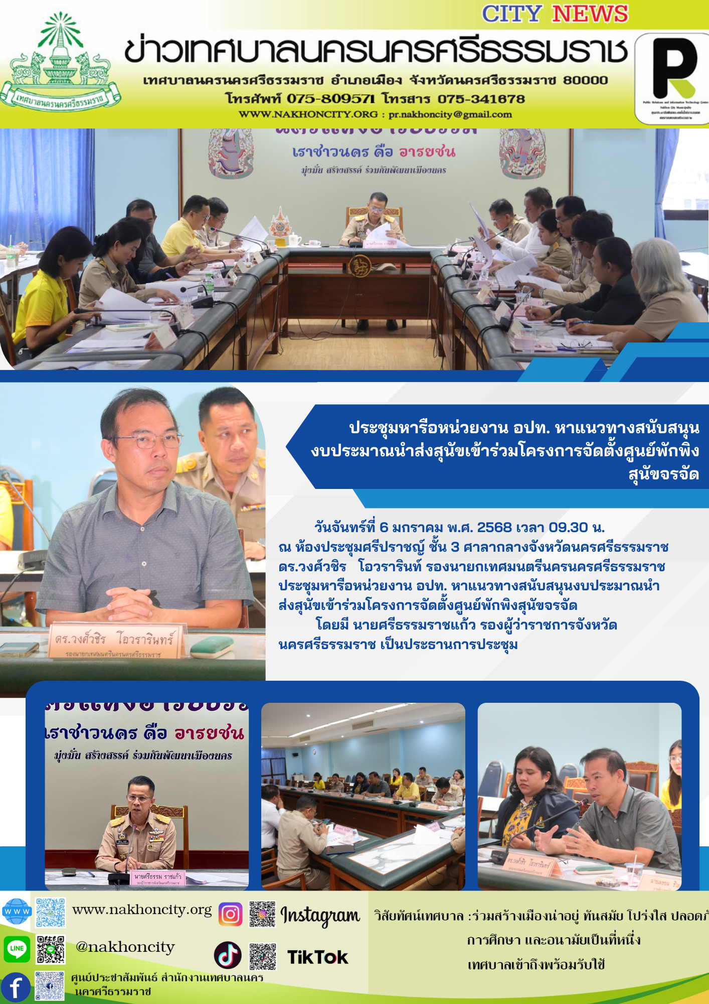 | วันจันทร์ที่ 6 มกราคม พ.ศ. 2568 เวลา 09.30 น. ณ ห้องประชุมศรีปราชญ์ ชั้น 3 ศาลากลางจังหวัดนครศรีธรรมราช ดร.วงศ์วชิร โอวรารินท์ รองนายกเทศมนตรีนครนครศรีธรรมราช ประชุมหารือหน่วยงาน อปท. หาแนวทางสนับสนุนงบประมาณนำส่งสุนัขเข้าร่วมโครงการจัดตั้งศูนย์พักพิงสุนัขจรจัด โดยมี นายศรีธรรม ราชแก้ว รองผู้ว่าราชการจังหวัดนครศรีธรรมราช เป็นประธานการประชุม |