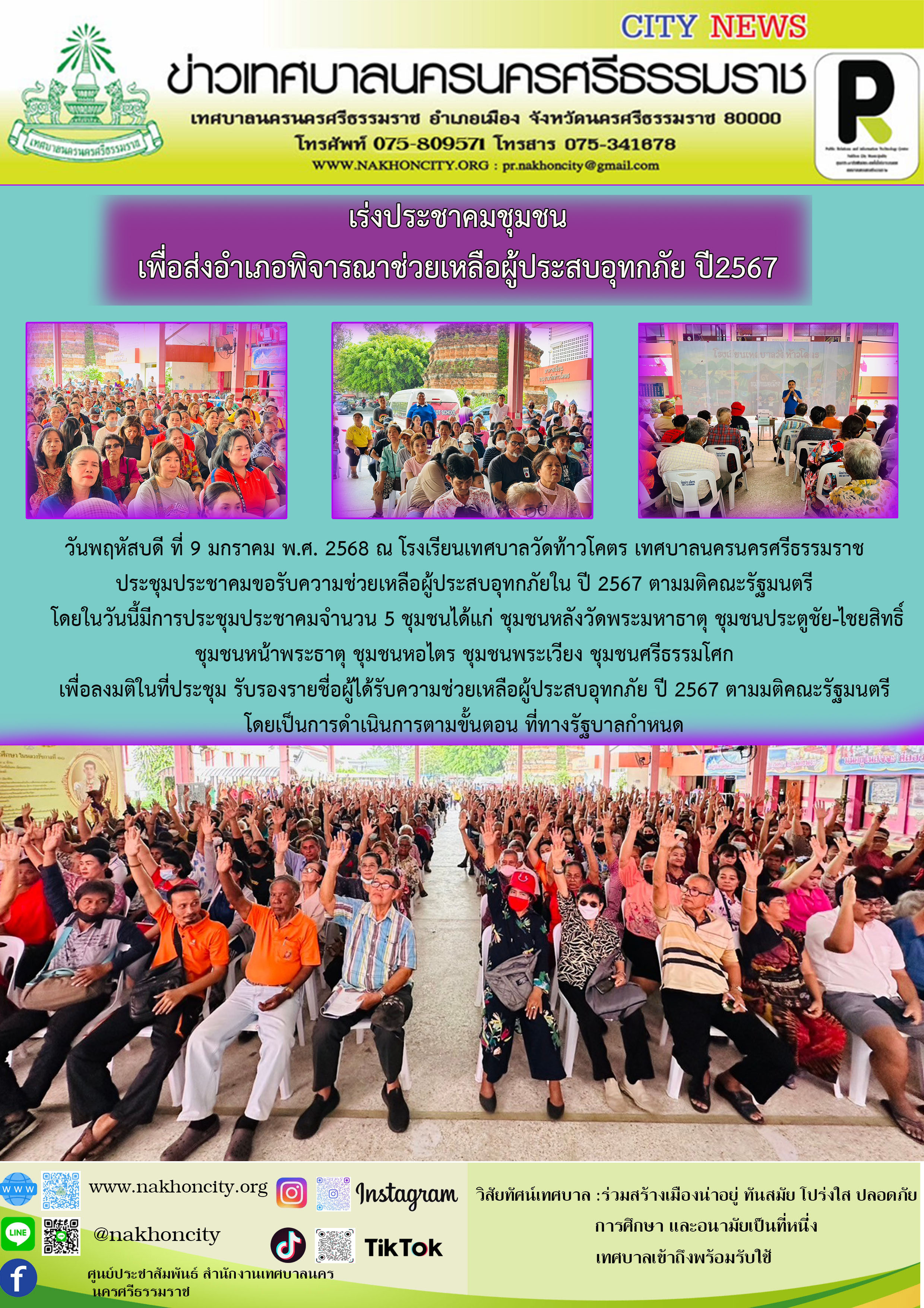| วันพฤหัสบดี ที่ 9 มกราคม พ.ศ. 2568 ณ โรงเรียนเทศบาลวัดท้าวโคตร เทศบาลนครนครศรีธรรมราช ประชุมประชาคมขอรับความช่วยเหลือผู้ประสบอุทกภัยใน ปี 2567 ตามมติคณะรัฐมนตรี