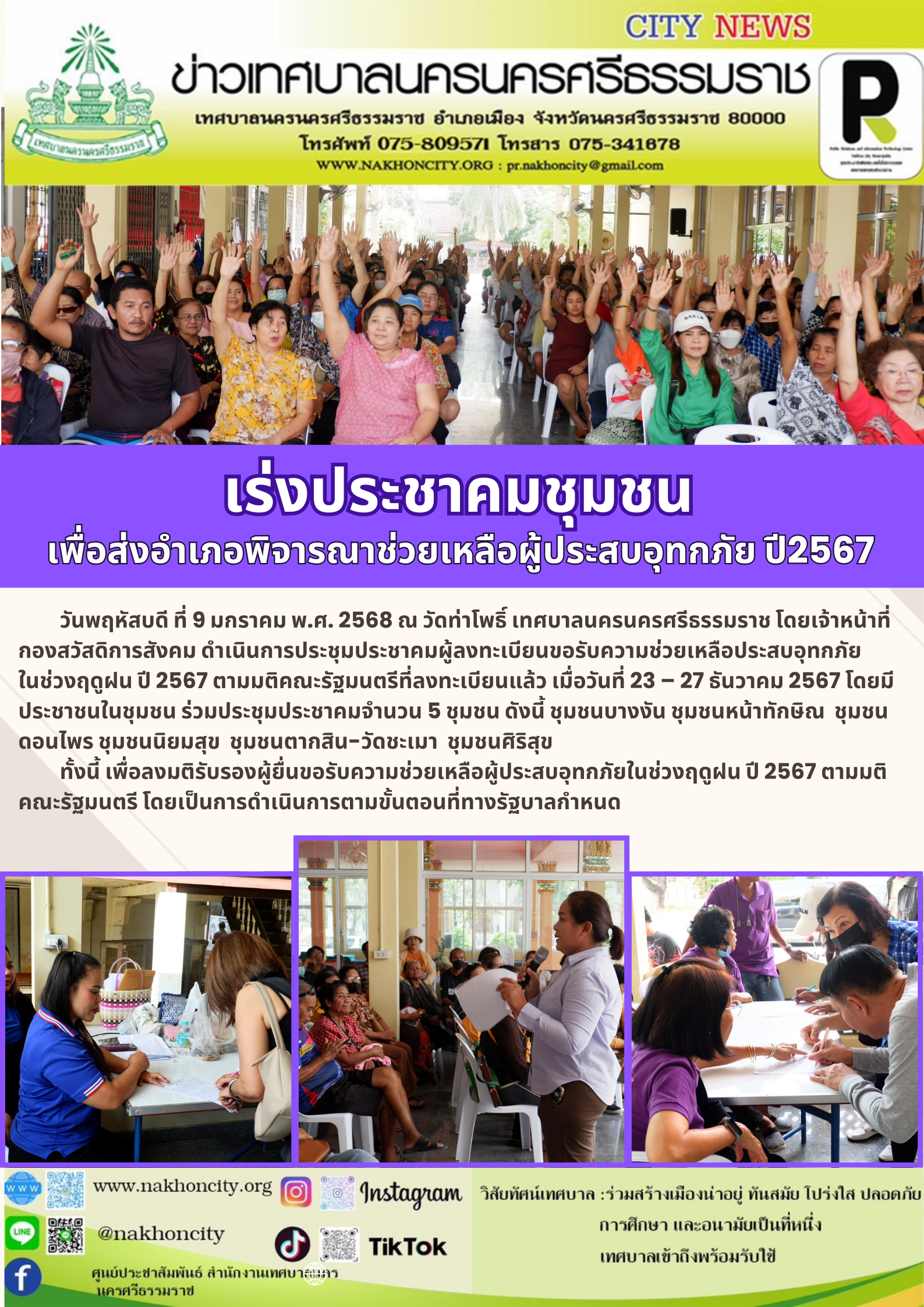 | วันพฤหัสบดี ที่ 9 มกราคม พ.ศ. 2568 ณ วัดท่าโพธิ์ เทศบาลนครนครศรีธรรมราช โดยเจ้าหน้าที่กองสวัสดิการสังคม ดำเนินการประชุมประชาคมผู้ลงทะเบียนขอรับความช่วยเหลือประสบอุทกภัยในช่วงฤดูฝน ปี 2567 ตามมติคณะรัฐมนตรีที่ลงทะเบียนแล้ว เมื่อวันที่ 23 – 27 ธันวาคม 2567 โดยมีประชาชนในชุมชน ร่วมประชุมประชาคมจำนวน 5 ชุมชน ดังนี้ ชุมชนบางงัน ชุมชนหน้าทักษิณ ชุมชนดอนไพร ชุมชนนิยมสุข ชุมชนตากสิน-วัดชะเมา ชุมชนศิริสุข ทั้งนี้ เพื่อลงมติรับรองผู้ยื่นขอรับความช่วยเหลือผู้ประสบอุทกภัยในช่วงฤดูฝน ปี 2567 ตามมติคณะรัฐมนตรี โดยเป็นการดำเนินการตามขั้นตอนที่ทางรัฐบาลกำหนด |