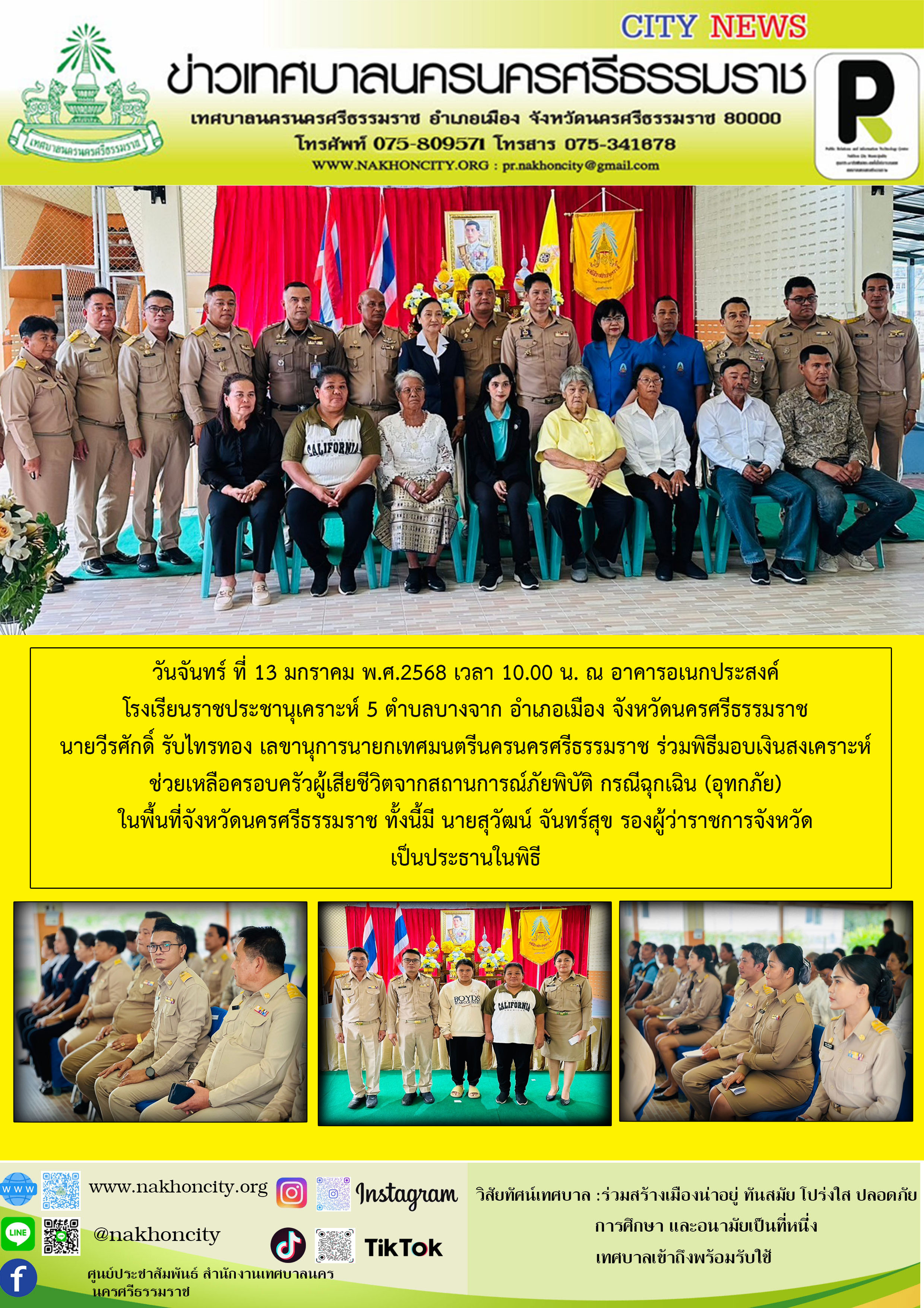 | เลขานุการนายกเทศมนตรีนครนครศรีธรรมราช ร่วมพิธีมอบเงินสงเคราะห์ช่วยเหลือครอบครัวผู้เสียชีวิตจากสถานการณ์ภัยพิบัติ กรณีฉุกเฉิน (อุทกภัย) ในพื้นที่จังหวัดนครศรีธรรมราช |