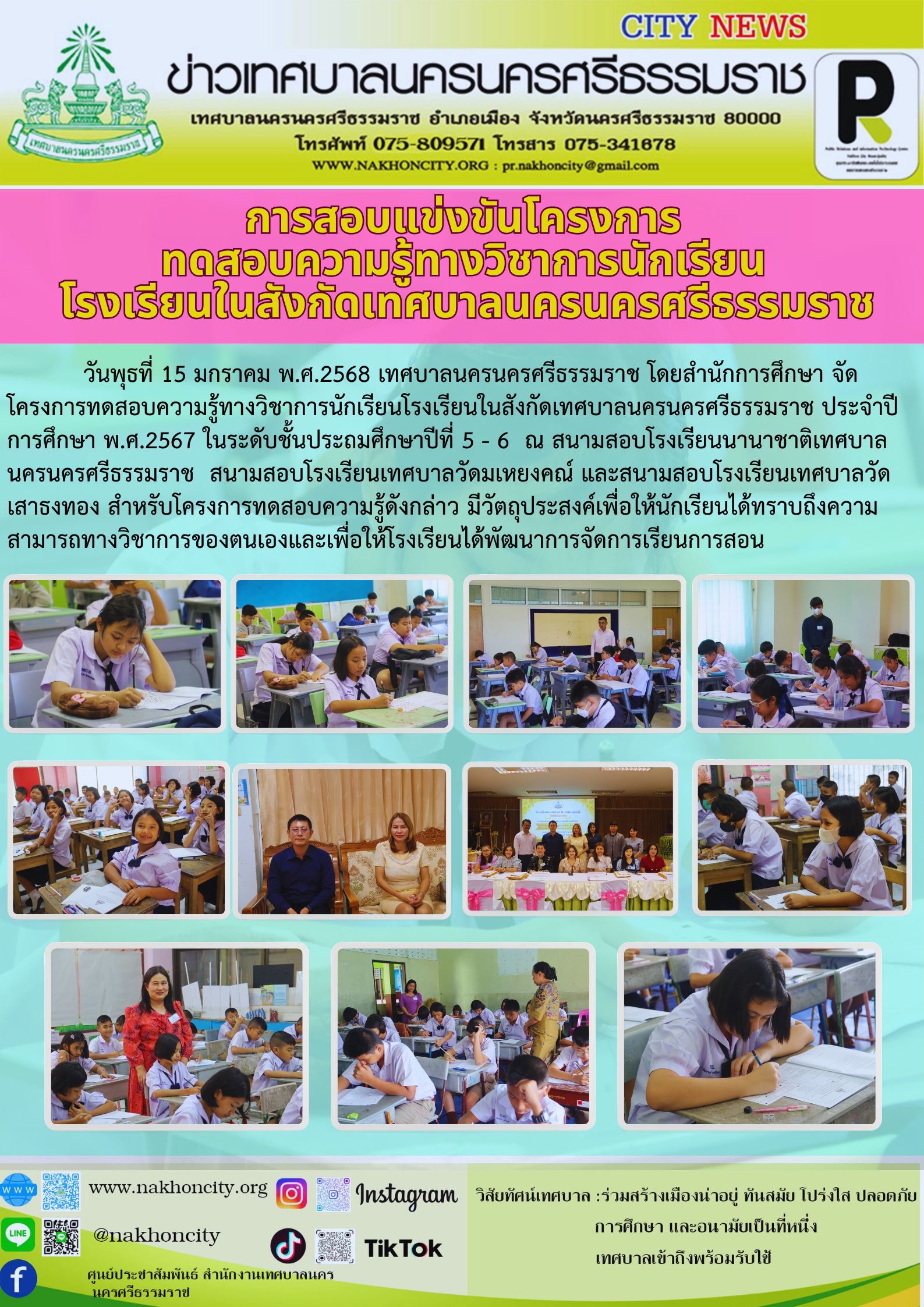 | วันพุธที่ 15 มกราคม พ.ศ.2568 เทศบาลนครนครศรีธรรมราช โดยสำนักการศึกษา จัดโครงการทดสอบความรู้ทางวิชาการนักเรียนโรงเรียนในสังกัดเทศบาลนครนครศรีธรรมราช ประจำปีการศึกษา พ.ศ.2567 ในระดับชั้นประถมศึกษาปีที่ 5 - 6 ณ สนามสอบโรงเรียนนานาชาติเทศบาลนครนครศรีธรรมราชสนามสอบโรงเรียนเทศบาลวัดมเหยงคณ์ และสนามสอบโรงเรียนเทศบาลวัดเสาธงทอง สำหรับโครงการทดสอบความรู้ดังกล่าว มีวัตถุประสงค์เพื่อให้นักเรียนได้ทราบถึงความสามารถทางวิชาการของตนเองและเพื่อให้โรงเรียนได้พัฒนาการจัดการเรียนการสอน |