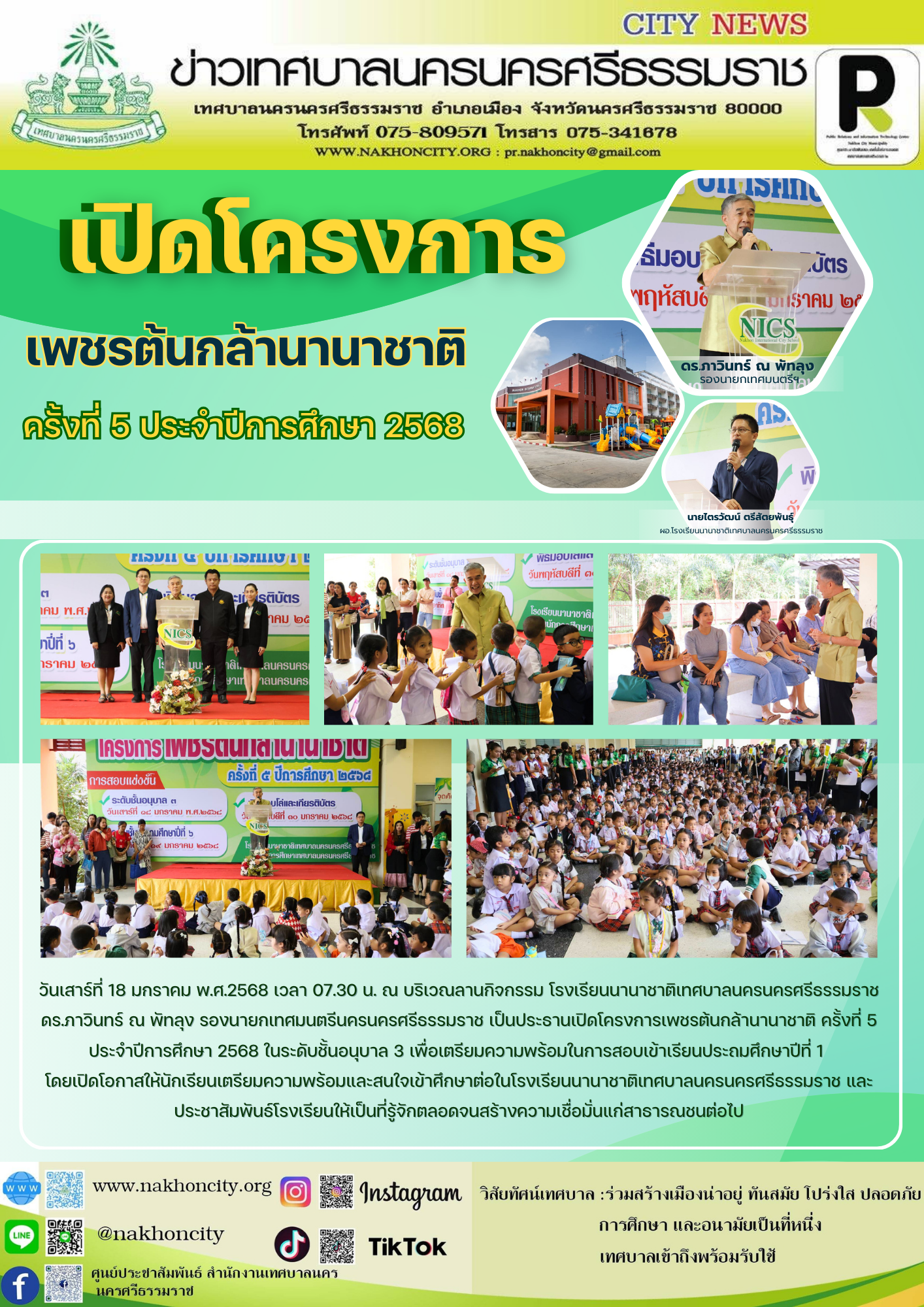 | ดร.ภาวินทร์ ณ พัทลุง รองนายกเทศมนตรีนครนครศรีธรรมราช เป็นประธานเปิดโครงการเพชรต้นกล้านานาชาติ ครั้งที่ 5 ประจำปีการศึกษา 2568 |