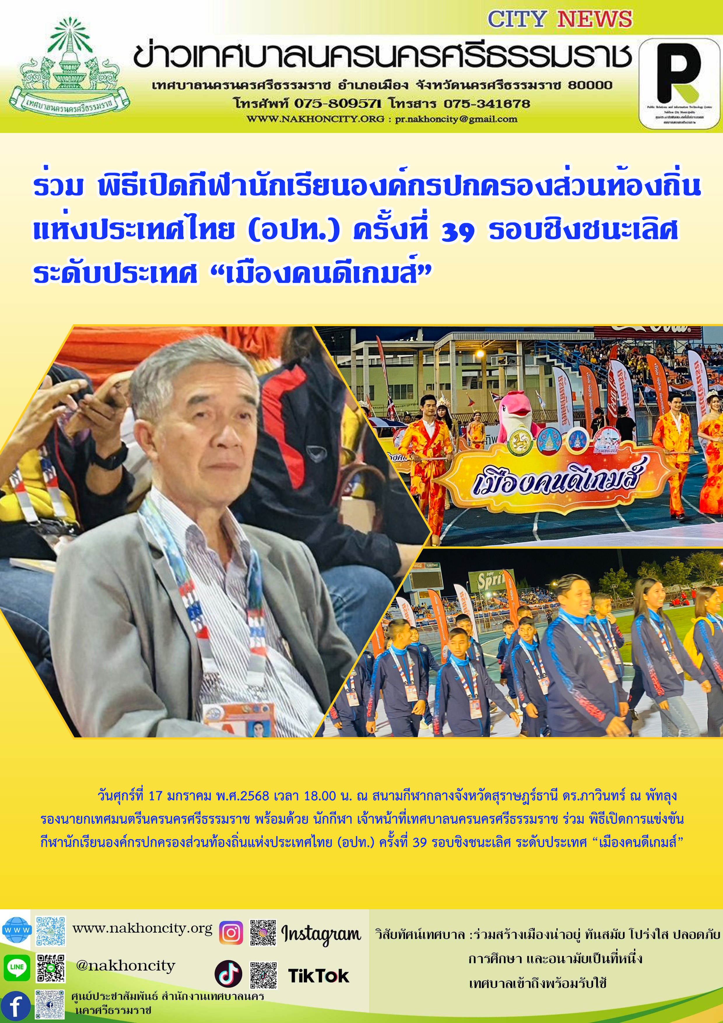 | วันศุกร์ที่ 17 มกราคม พ.ศ.2568 เวลา 18.00 น. ณ สนามกีฬากลางจังหวัดสุราษฎร์ธานี ดร.ภาวินทร์ ณ พัทลุง รองนายกเทศมนตรีนครนครศรีธรรมราช พร้อมด้วย นักกีฬา เจ้าหน้าที่เทศบาลนครนครศรีธรรมราช ร่วม พิธีเปิดการแข่งขัน กีฬานักเรียนองค์กรปกครองส่วนท้องถิ่นแห่งประเทศไทย (อปท.) ครั้งที่ 39 รอบชิงชนะเลิศ ระดับประเทศ “เมืองคนดีเกมส์” |