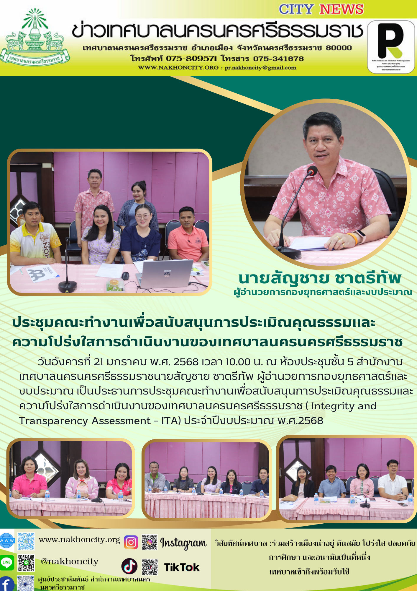 | วันอังคารที่ 21 มกราคม พ.ศ. 2568 เวลา 10.00 น. ณ ห้องประชุมชั้น 5 สำนักงานเทศบาลนครนครศรีธรรมราช นายสัญชาย ชาตรีทัพ ผู้อำนวยการกองยุทธศาสตร์และงบประมาณ เป็นประธานการประชุมคณะทำงานเพื่อสนับสนุนการประเมิณคุณธรรมและความโปร่งใสการดำเนินงานของเทศบาลนครนครศรีธรรมราช ( Integrity and Transparency Assessment – ITA) ประจำปีงบประมาณ พ.ศ.2568