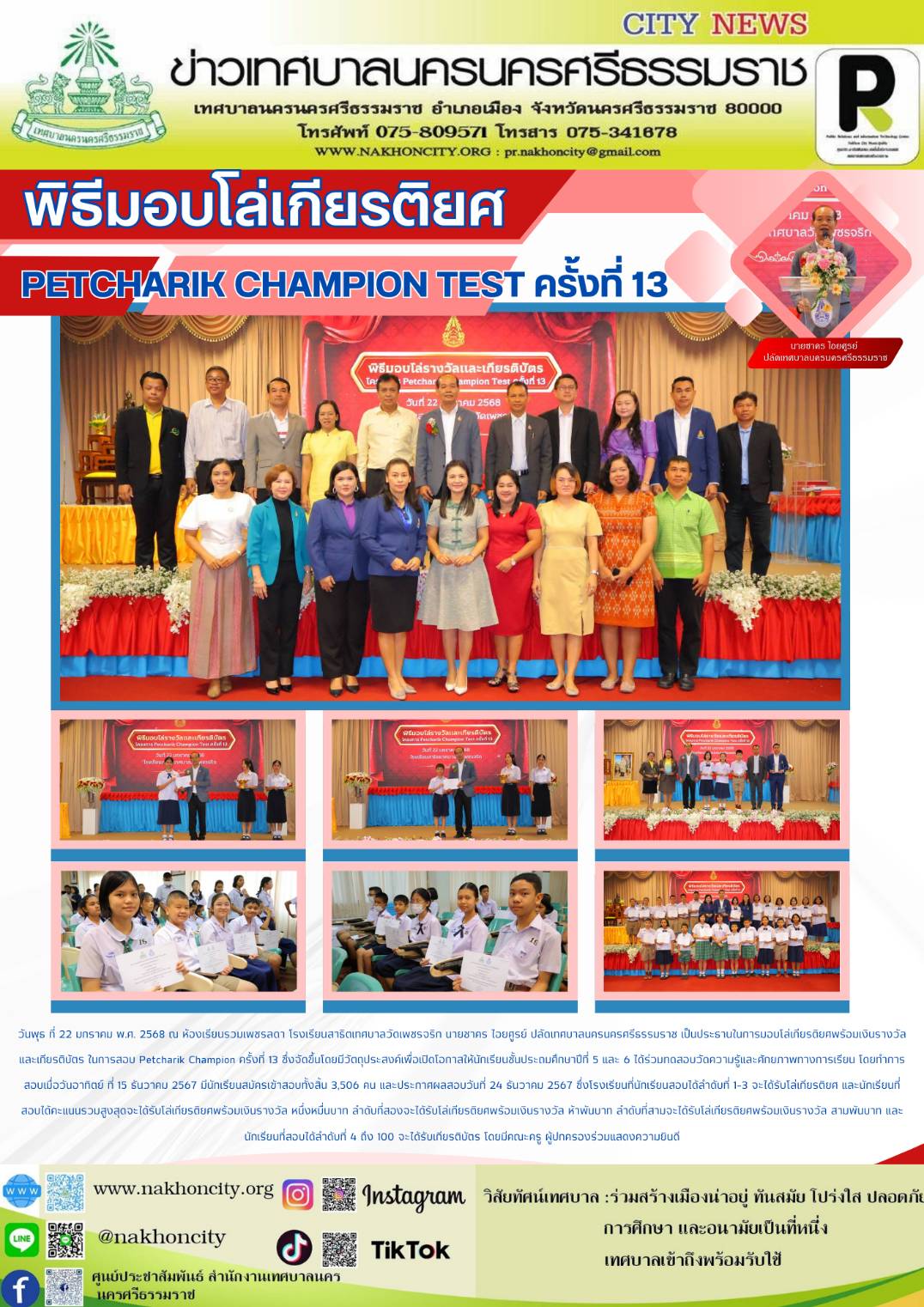 | นายชาคร ไอยศูรย์ ปลัดเทศบาลนครนครศรีธรรมราช เป็นประธานในการมอบโล่เกียรติยศพร้อมเงินรางวัลและเกียรติบัตร ในการสอบ Petcharik Champion ครั้งที่ 13 |