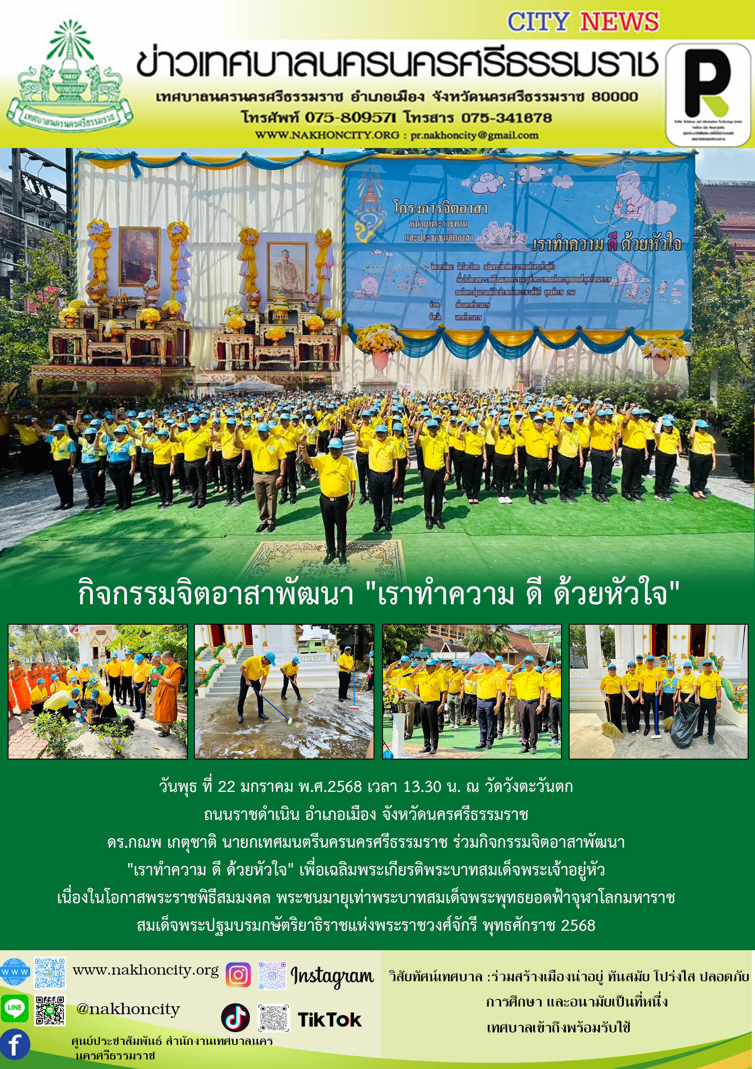 | นายกเทศมนตรีนครนครศรีธรรมราช ร่วมกิจกรรมจิตอาสาพัฒนา "เราทำความ ดี ด้วยหัวใจ" เพื่อเฉลิมพระเกียรติพระบาทสมเด็จพระเจ้าอยู่หัว เนื่องในโอกาสพระราชพิธีสมมงคลพระชนมายุเท่าพระบาทสมเด็จพระพุทธยอดฟ้าจุฬาโลกมหาราช สมเด็จพระปฐมบรมกษัตริยาธิราชแห่งพระราชวงศ์จักรี พุทธศักราช 2568 |
