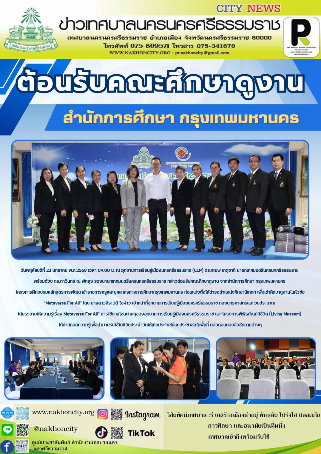 | วันพฤหัสบดีที่ 23 มกราคม พ.ศ.2568 เวลา 09.00 น. ณ อุทยานการเรียนรู้เมืองนครศรีธรรมราช (CLP) ดร.กณพ เกตุชาติ นายกเทศมนตรีนครนคศรีธรรมราช พร้อมด้วย ดร.ภาวินทร์ ณ พัทลุง รองนายกเทศมนตรีนครนครศรีธรรมราช กล่าวต้อนรับคณะศึกษาดูงาน จากสำนักการศึกษา กรุงเทพมหานคร โครงการฝึกอบรมหลักสูตรการพัฒนาข้าราชการครูและบุคลากรทางการศึกษากรุงเทพมหานคร ก่อนแต่งตั้งให้ดำรงตำแหน่งศึกษานิเทศก์ เพื่อเข้าศึกษาดูงานในหัวข้อ “Metaverse For All” โดย นางสาวจิระวดี ใจห้าว เจ้าหน้าที่อุทยานการเรียนรู้เมืองนครศรีธรรมราช กองยุทธศาสตร์และงบประมาณ ได้บรรยายให้ความรู้เรื่อง Metaverse For All” การใช้งานโซนต่างๆของอุทยานการเรียนรู้เมืองนครศรีธรรมราช และโครงการพิพิธภัณฑ์มีชีวิต (Living Museum) ได้ถ่ายทอดความรู้เพื่อนำมาปรับใช้ในชีวิตประจำวันให้เกิดประโยชน์แก่ประชาชนในพื้นที่ ตลอดจนตอบข้อซักถามต่างๆ ................ ภาพ//ข่าว//จันทร์จิรา ตรวจทาน//ฐิตินันท์ |
