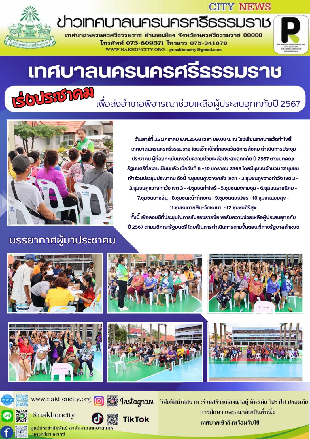 | วันเสาร์ที่ 25 มกราคม พ.ศ.2568 เวลา 09.00 น. ณ โรงเรียนเทศบาลวัดท่าโพธิ์ เทศบาลนครนครศรีธรรมราช โดยเจ้าหน้าที่กองสวัสดิการสังคม ดำเนินการประชุมประชาคม ผู้ที่ลงทะเบียนขอรับความช่วยเหลือประสบอุทกภัย ปี 2567 ตามมติคณะรัฐมนตรีที่ลงทะเบียนแล้ว เมื่อวันที่ 6 – 10 มกราคม 2568 และผู้ที่ลงทะเบียนบ้านที่ไม่มีเลขที่โดยมีชุมชนจำนวน 12 ชุมชนเข้าร่วมประชุมประชาคม ดังนี้ 1. ชุมชนคูขวางคลัง เขต 1 2. ชุมชนคูขวางท่าวัง เขต 2 3. ชุมชนคูขวางท่าวัง เขต 3 4. ชุมชนท่าโพธิ์ 5. ชุมชนมะขามชุม 6. ชุมชนราชนิคม 7. ชุมชนบางงัน 8. ชุมชนหน้าทักษิณ 9. ชุมชนดอนไพร 10. ชุมชนนิยมสุข 11. ชุมชนตากสิน-วัดชะเมา 12. ชุมชนศิริสุข ทั้งนี้ เพื่อขอมติที่ประชุมในการรับรองรายชื่อ ขอรับความช่วยเหลือผู้ประสบอุทกภัย ปี 2567 ตามมติคณะรัฐมนตรี โดยเป็นการดำเนินการตามขั้นตอน ที่ทางรัฐบาลกำหนด ................... ภาพ//ข่าว//จันทร์จิรา ตรวจทาน//ฐิตินันท์