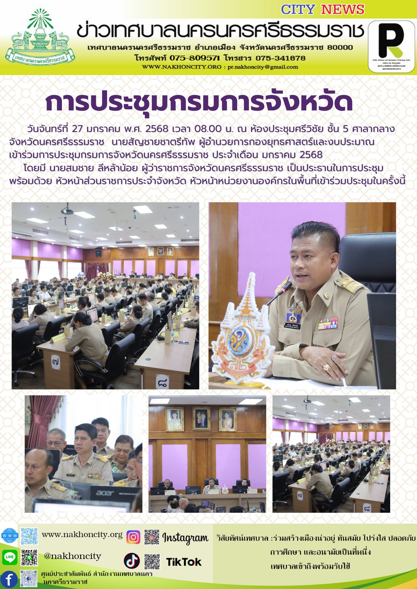 | วันจันทร์ที่ 27 มกราคม พ.ศ. 2568 เวลา 08.00 น. ณ ห้องประชุมศรีวิชัย ชั้น 5 ศาลากลางจังหวัดนครศรีธรรมราช นายสัญชาย ชาตรีทัพ ผู้อำนวยการกองยุทธศาสตร์และงบประมาณ เข้าร่วมการประชุม ประชุมกรมการจังหวัดนครศรีธรรมราช ประจำเดือน มกราคม 2568 โดยมี นายสมชาย ลีหล้าน้อย ผู้ว่าราชการจังหวัดนครศรีธรรมราช เป็นประธานในการประชุม พร้อมด้วย หัวหน้าส่วนราชการประจำจังหวัด หัวหน้าหน่วยงานองค์กรในพื้นที่เข้าร่วมประชุมในครั้งนี้ |